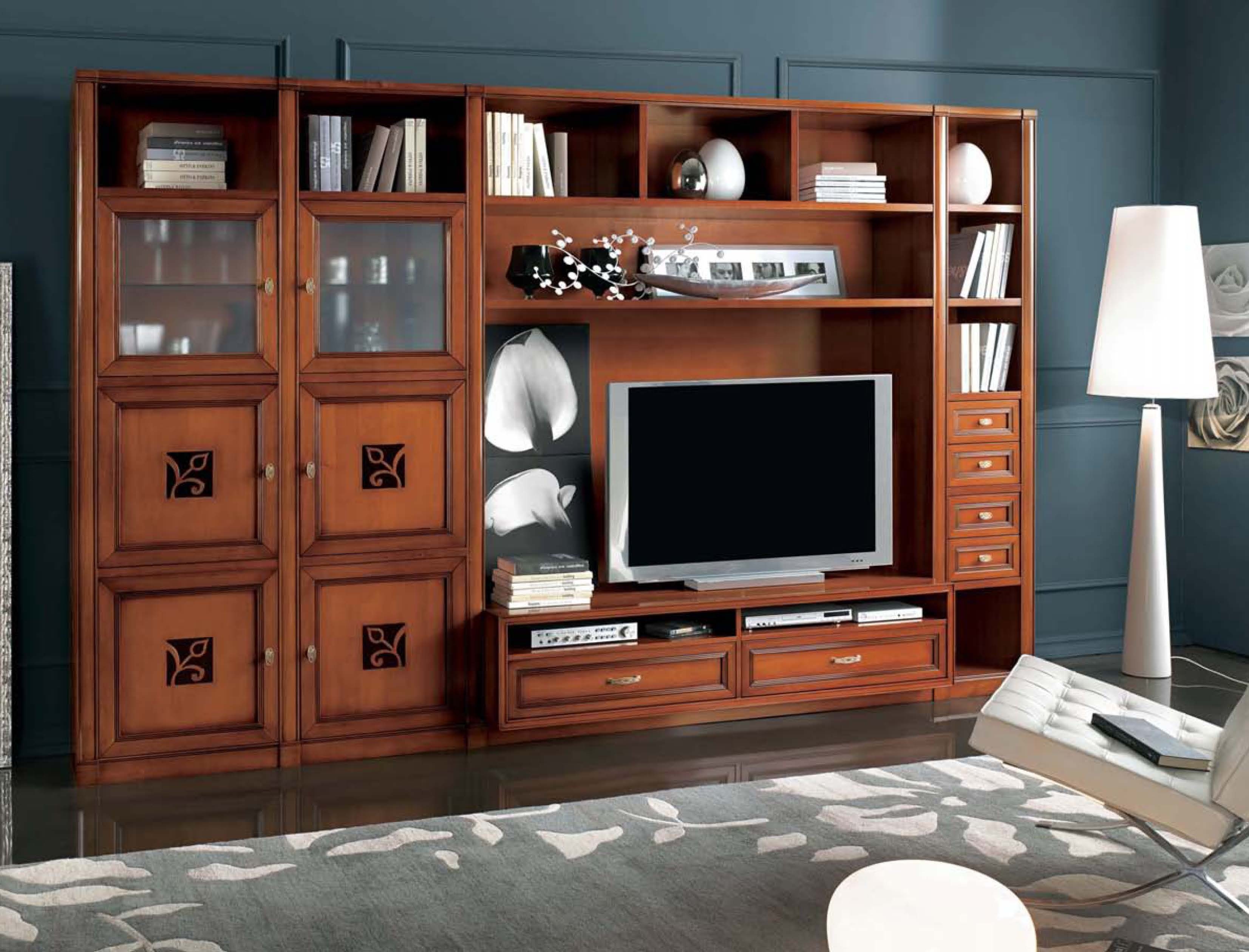 Modular Cabinet from Italian manufacturer Mirandola Export. The modular Cabinet is made in classic style. The frame is made of wood and finished in walnut. The model has open shelves, cabinets with wooden and glass doors, drawers of various sizes and a large compartment for TV. Roomy modular Cabinet Mirandola Export with a decorative pattern on the facade will be the Central element of Your living room.