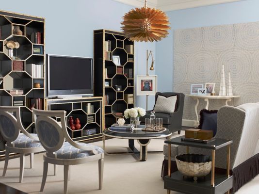 Cabinet Ravenel from the Celerie Kemble collection from the American manufacturer Henredon. Model in art Deco style can be used as bookcase or display cases for collections. The frame is made of Philippine mahogany hardwood and veneer from valuable breeds of a tree. A mirrored back panel, adjustable revelatory. Front panel with asymmetrical shelves and end panels finished in a soft brass and gold accents.