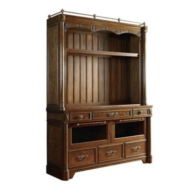 The Cabinet is a sideboard from the collection Westbury Manor from the American manufacturer Henredon. High capacious sideboard, executed in vintage style, can be used in dining room, living room or kitchen. Made from Philippine mahogany hardwood, doors and panels covered with veneer of American walnut, and walnut and veneer angel stump. Eight drawers of different sizes, two of them with a glass front. Top center is provided with a tray for silverware. Two open shelves; medium is provided with holes for power cords and lets you place the TV or other equipment. Top shelf with carved cornice, side stand also decorated with carvings, fittings - antique brass.