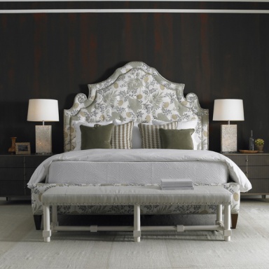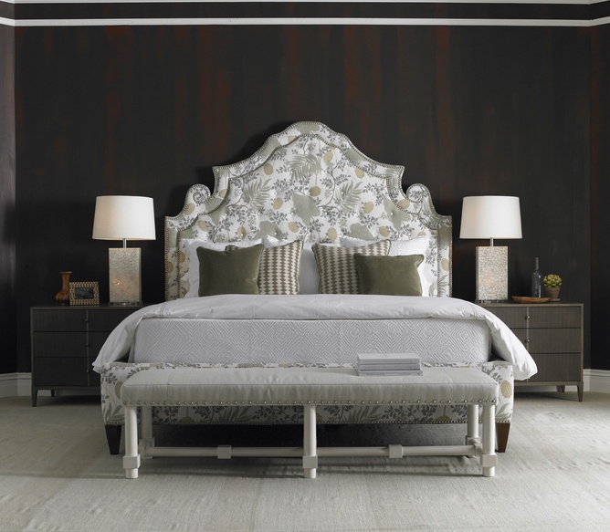 Bed Shelter Island from the American manufacturer MotionCraft made by Mr child. & Mrs. Howard. Bed with high headboard in a neoclassical style fits perfectly in any bedroom interior. Frame, base, legs and headboard made of solid wood. Base and headboard upholstered in figured textiles, filler - foam; headboard, the contour is trimmed with a double row of studs and furniture embellished with stitch Capito. The platform base along the bottom edge is also finished with furniture near studs. The bed shown in the SOHO finish; available in different finishes and in sizes Queen and king. Textiles tiny floral print shown in photo 2, completely changes the look and style of the model. The color and texture of upholstery you can choose in the catalog of the manufacturer.