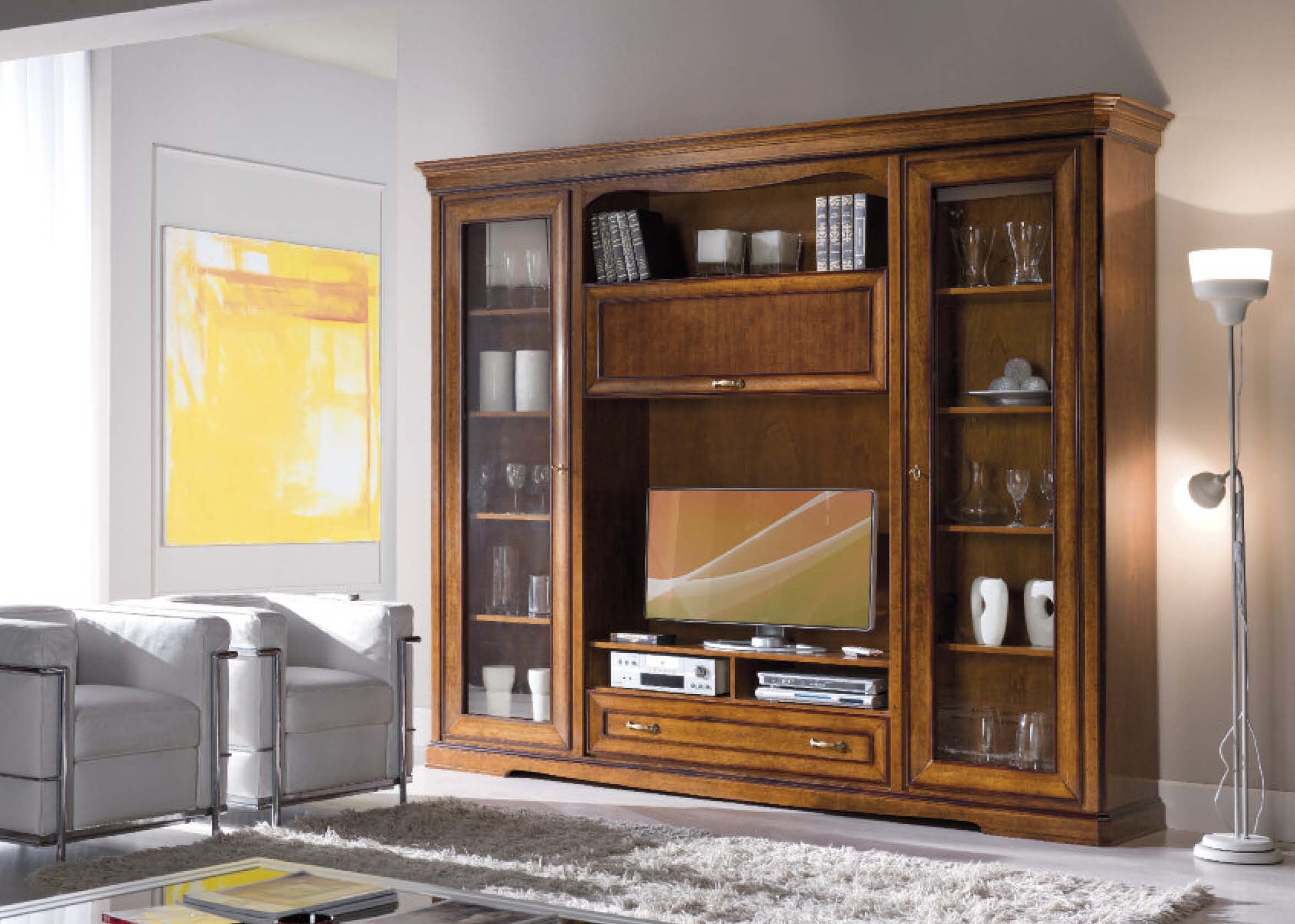 Cabinet for TV from the Italian manufacturer Mirandola Export. The model is made in classic style. The frame is made of wood. The Cabinet has two display cases with glass doors, shelf for books, a drawer, two compartments for equipment, a hinged panel and a TV. Perfect wardrobe Mirandola Export will decorate Your interior and create a comfortable atmosphere in the living room.