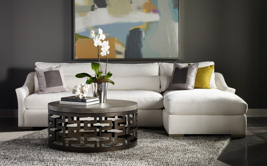 Table Belgrave from the collection of Modern Archives from the American manufacturer MotionCraft made subsidiary Lilian August. Comfortable round table in art Deco style will decorate the living room. Can serve as a cocktail, coffee or coffee. The base is made of carved metal. The wood is laid on top of the concrete artificial upper generatrix, which she artistically combined, and covered with a layer of paint. Then the top is sealed with a transparent coating that provides a flawless appearance. Color scheme - shades of gray from light to dark.