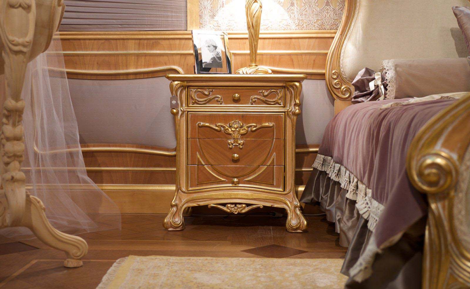 Bedside table from the Italian manufacturer Medea. The model includes several drawers. The body is made of wood. The varnish finish offered. Decoration are decorative carved elements.