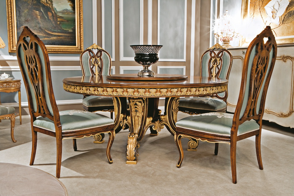 Dining table from the Italian manufacturer Medea. Model with a round top. Material - wood. The varnish finish offered. The surface is decorated with ornamental carvings and paintings. Is practical and compact.