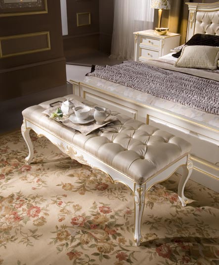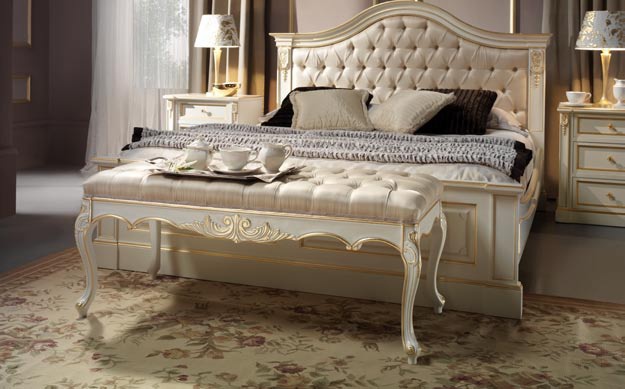 Beatrice bedroom set from the Italian manufacturer Onlywood. This set includes: double bed with high upholstered headboard in zig-Capito, bedside tables and bench, a chest of drawers and wall mirror. Base, frame, the frame is made of solid wood. The finish is lacquer from the range of the manufacturer. Decor stands hand carved in gilt. Accessories exquisite metal. Set in a classic style. Colors, textiles - catalogue of the manufacturer.