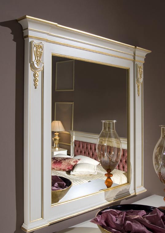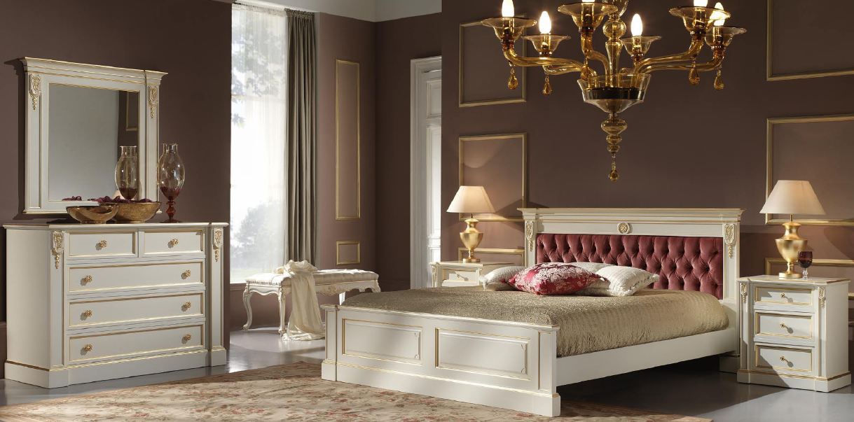Set for bedroom Beatrice from the Italian manufacturer Onlywood. The set includes: bed with high padded headboard, bedside tables, chest of drawers, wall mirror, upholstered bench. Base, frame, frame made of solid wood. The coating acts as a varnish according to the manufacturer. Products are decorated with carvings in gold leaf handmade. Textiles from a wide range. Set in classic style, filled with luxury bedroom interior.