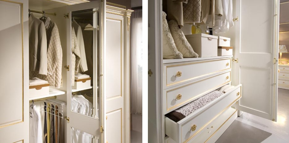 Cabinet Beatrice from the Italian manufacturer Onlywood. Model 4-folding with sliding drawers. The base frame is made of solid wood. Accessories metal. The coating is a varnish based on manufacturer's catalogue. The product is decorated with carvings in gold leaf handmade. Wardrobe in classic style, complement the luxurious interior of a bedroom.