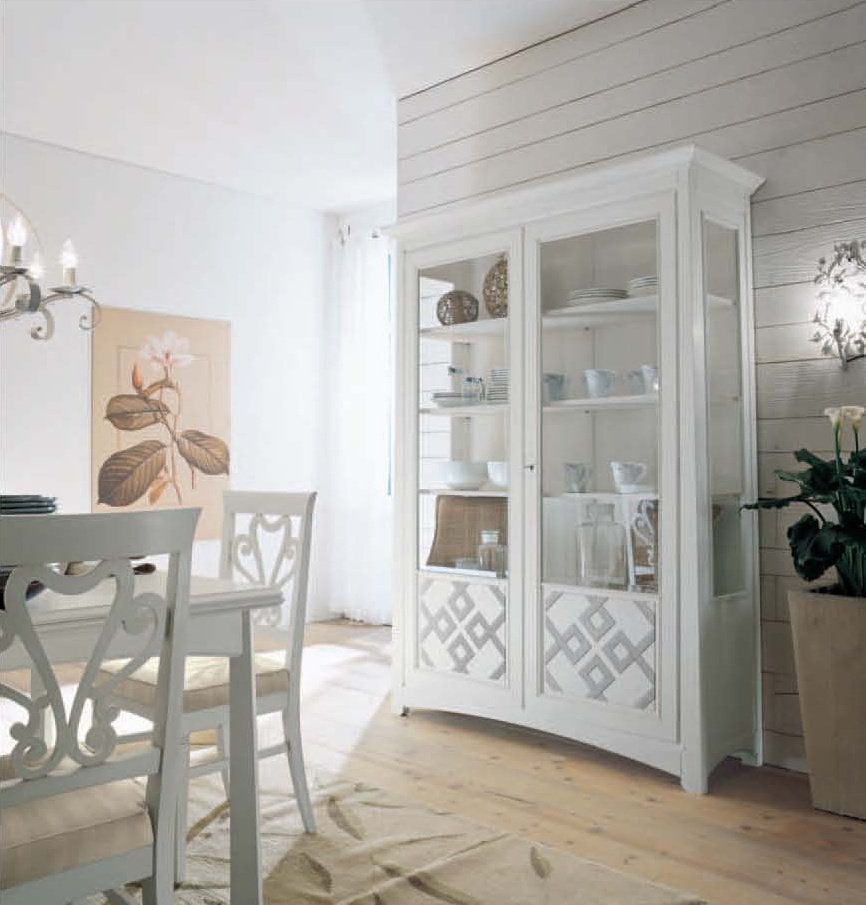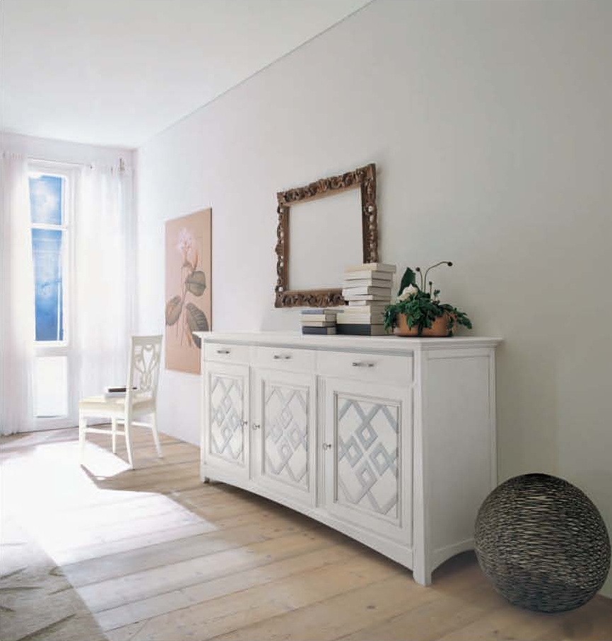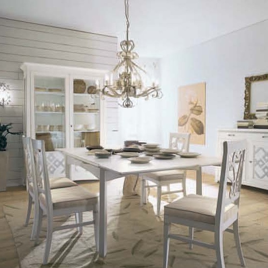 Dining room (dining set) from the Italian manufacturer Mirandola Export. Elegant set consists of a showcase, cupboard, table and chairs. The model is executed in classical style, frame made of wood. Showcase has two glass doors and three shelves. The sideboard has three pullout drawers and doors. Dining extendable table can be different sizes. The chairs have decorative carved back and upholstered seat with upholstery textiles. Beautiful set of Mirandola Export carved facade will decorate Your interior.