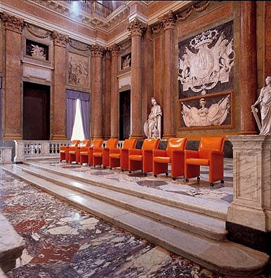 VIP chair / V from the Italian manufacturer Mascheroni. The product is upholstered with genuine leather. The model is working for visitors is designed for a living room or a public room in a modern style. Colors: beige, orange, green.