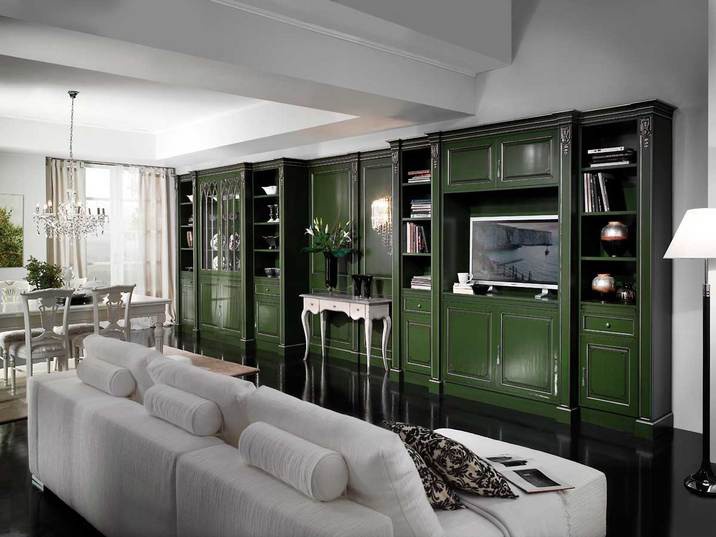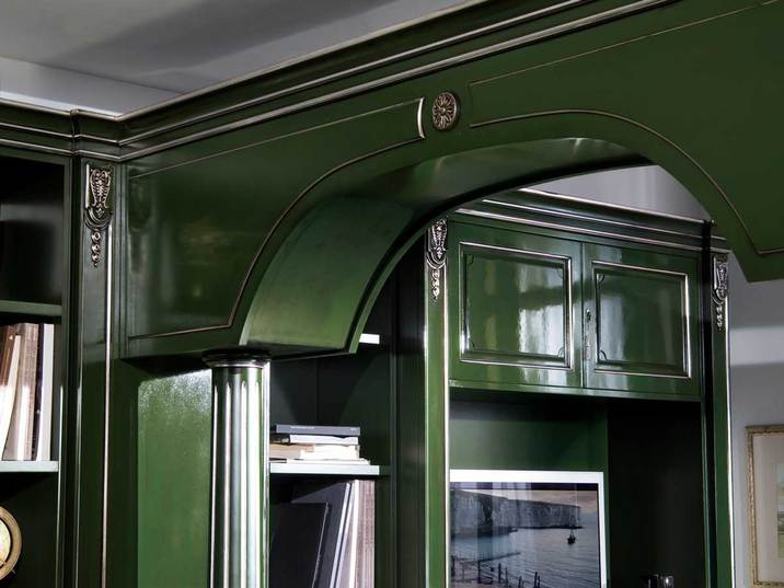 Panel boiserie Beatrice from the Italian manufacturer Onlywood. Boiserie includes shelving, interior bridge. The base, the base is made of solid wood. The finish is the varnish catalog. Elegant carved elements in silver give the product sophistication and elegance. Boiserie in a classic style, the perfect decorative and functional solution for the classic interior.