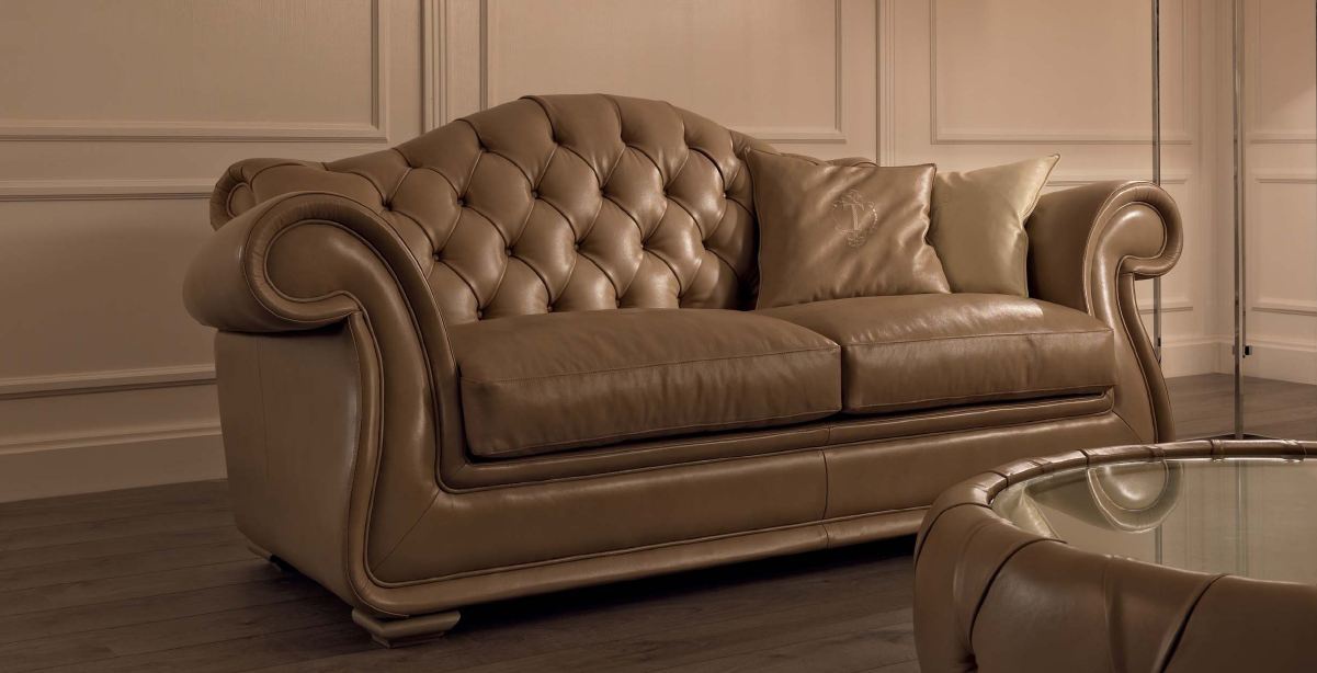 Brema three-seater sofa from Italian manufacturer Tosconova. Frame, base made of solid wood in combination with metal. Filler - polyurethane foam. The upholstery is of leather, a choice of a wide palette of shades. Cushioned seats removable. Decor stands stitch-Capito. The product can be supplemented with decorative pillows. A luxurious choice for the modern interior living room.