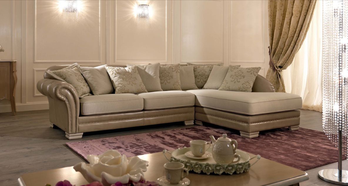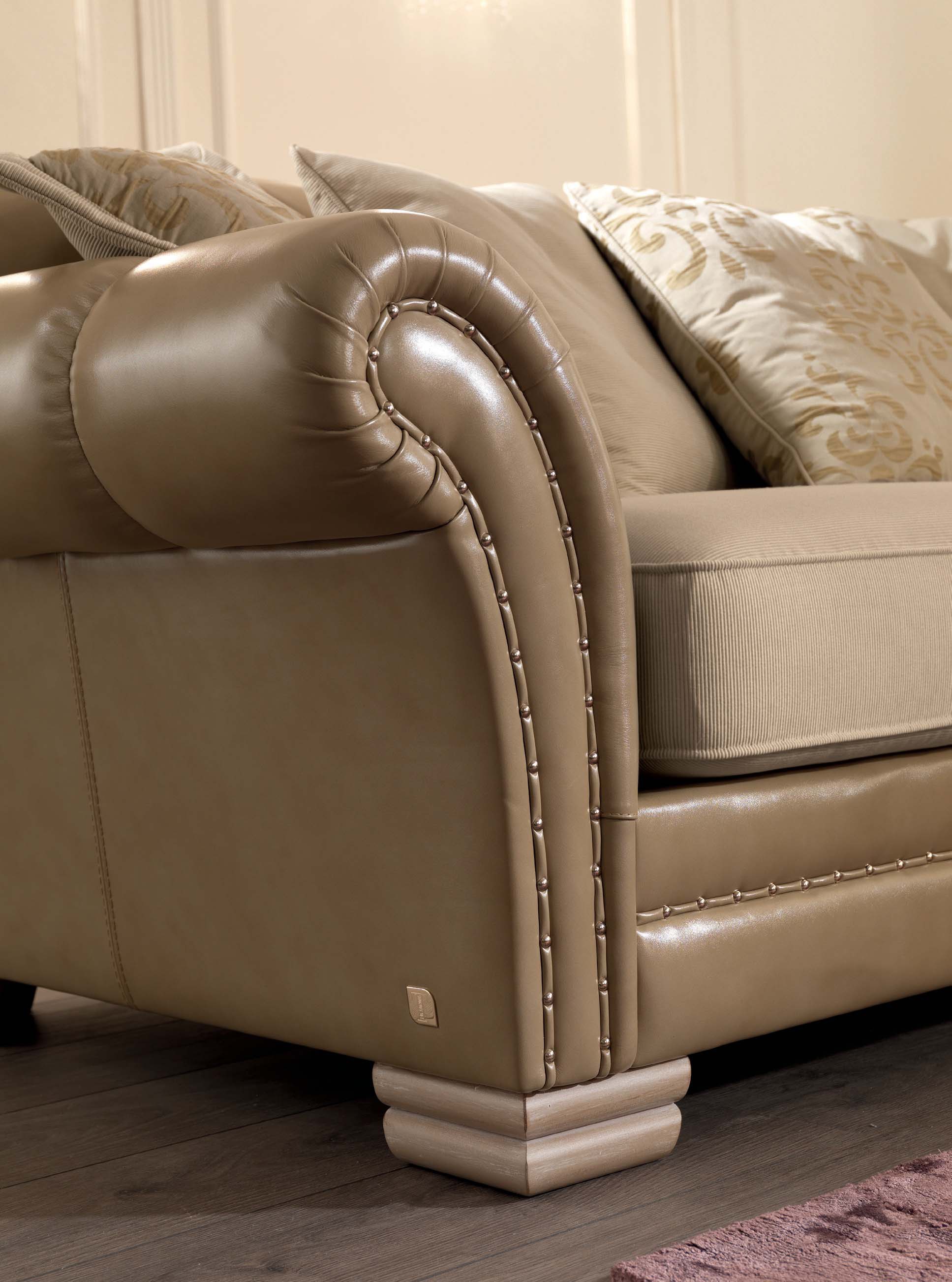 Sofa corner triple from Mediterraneo Italian manufacturer Tosconova. Frame, base is made of solid wood in combination with metal. Filler - polyurethane foam. Upholstery is a composition of leather and textiles to choose from - wide range of colors. Cushioned seats removable. The product can be supplemented with decorative pillows, catalog no. A luxurious choice for the modern interior living room.