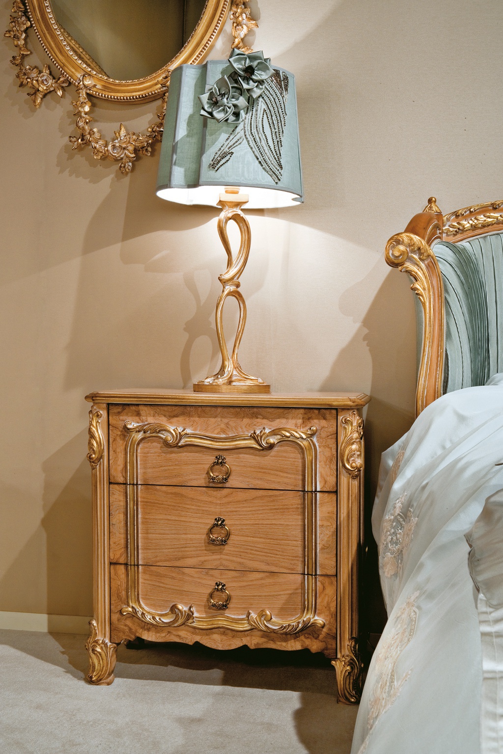 Bedside table from the Italian manufacturer Medea. The model includes three drawers. The body and legs of wood. The finishing - varnish. The color palette in the catalog of the company. The metal fittings. The surface decorated with a decorative carving handmade.