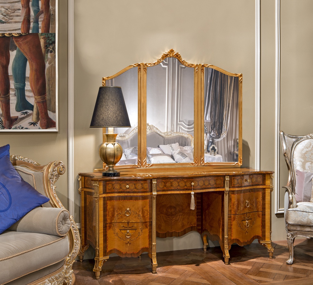 Dressing table from the Italian manufacturer Medea. Shell and frame made of wood. The surface is covered with a glossy varnish. Accessories metal. Decoration is the decorative carving handmade. Distinguished by elegance and practicality.