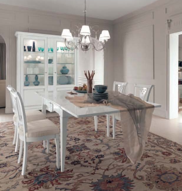 Dining room (dining set) from the Italian manufacturer Mirandola Export. Set consists of showcases, sideboard, dining table and chairs and done in a classic style. The frame is made of wood, upholstery of chairs and textiles. Two-door vitrine has glass shelves and internal lights. The sideboard has two drawers and two doors. Dining extendable table can be different sizes. Chairs with decorative carved back has a soft comfortable seat. Elegant set of Mirandola Export will beautify Your dining room.