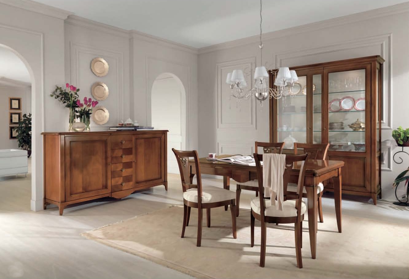 Dining room (dining set) from the Italian manufacturer Mirandola Export. Gorgeous set consists of a two-door showcase with glass shelves and internal lighting, cupboard with two doors, four drawers, sliding dining table and chairs with decorative carved back and upholstered seat. The frame is made of wood, upholstery - textiles. Set Mirandola Export will create a pleasant and light atmosphere in Your dining room.