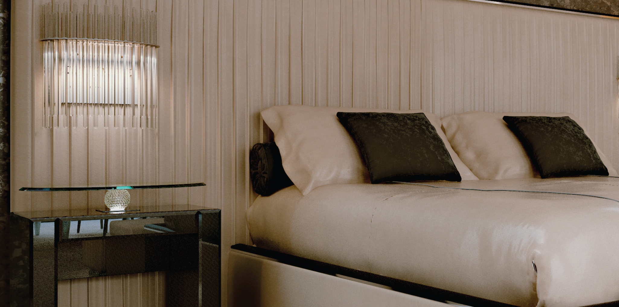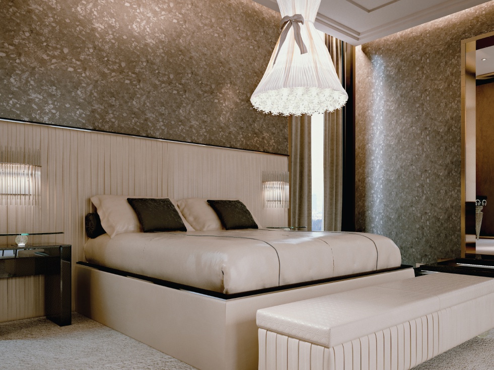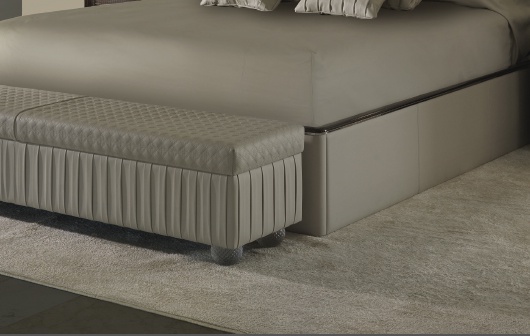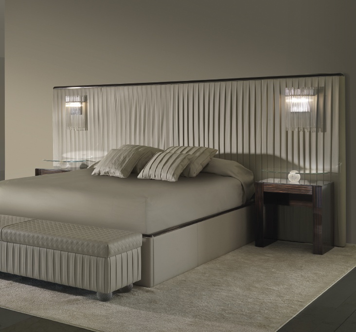 Bed Plisse XL from the Italian manufacturer Reflex Angelo. Double bed with space for storage looks great in any contemporary or traditional bedroom interior. High pleated headboard decorates the wall. The wooden frame is completely hidden under the upholstery of leather or velvet. The head of ebony manually decorated with pleating and metal edging Charleston; the same edging on the sides of the bed. Additional option - bilateral side lighting. The bed is available in five sizes with matching mattresses in parentheses indicate the width of the headboard. Colors to choose from a collection company.