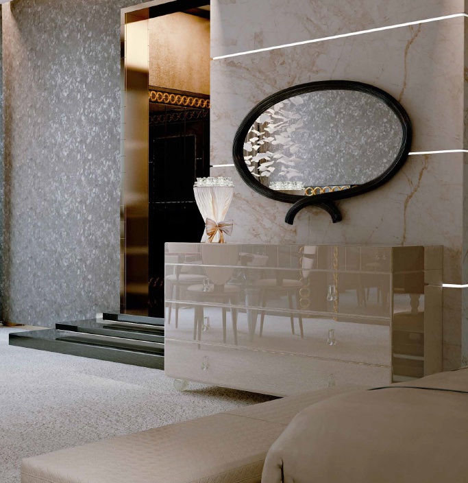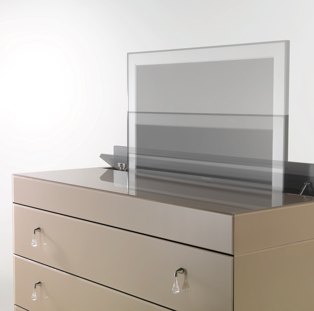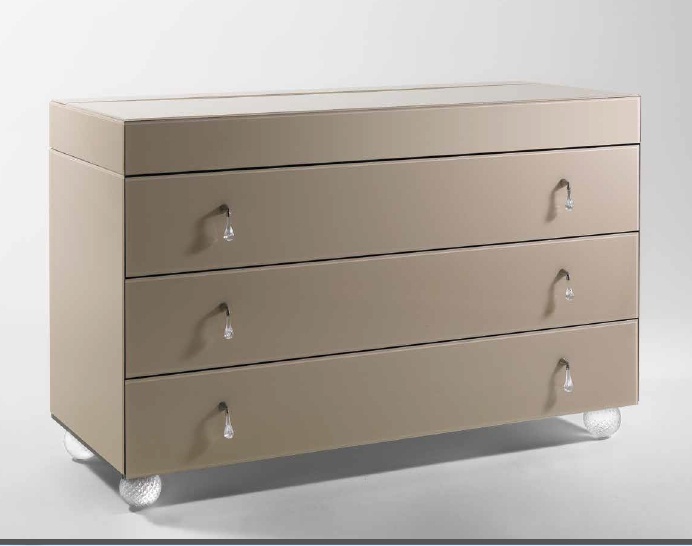 The Rialto chest of drawers from Italian manufacturer Reflex Angelo. The traditional model of rectangular form, decorated in art Deco style, will adorn any bedroom. The frame is made of wood coated with coloured glass, colours available: black, grey-blue, amber, red, tobacco, gold and amethyst. The model is equipped with three drawers with push-pull structure, the legs are made in the form of balls made of Murano glass. Pens, pendants Murano glass or cut crystal. Available the automatic extraction of the TV. Optional - engraved front.