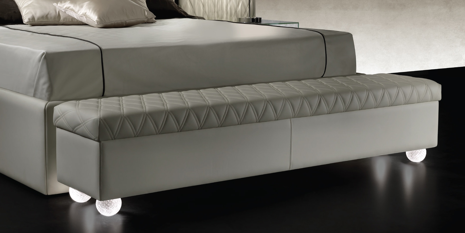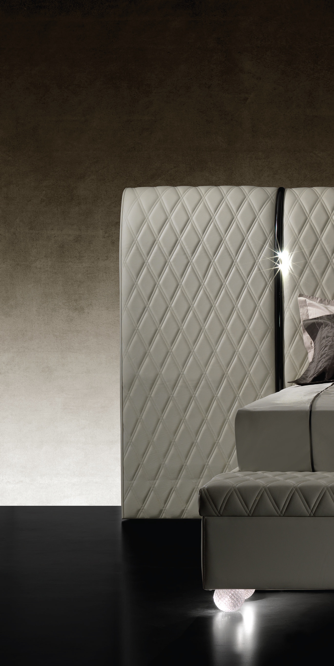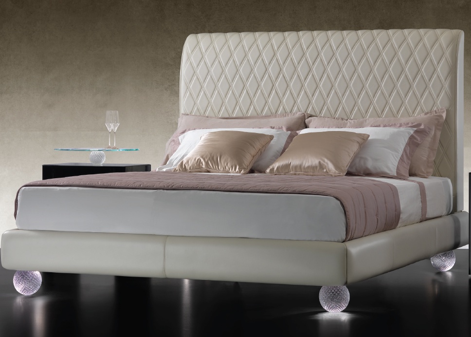 The Rialto bed from Italian manufacturer Reflex Angelo. Double bed in the art Deco style with a cushioned headboard looks great in any contemporary or traditional bedroom interior. The wooden frame is completely hidden under the leather, velvet or nubuck. Headboard manually decorated with diamond stitch Diamond mimic diamond pattern. The legs are hand made balls of Murano glass, transparent or colored. The bed is available in five sizes with matching mattresses. Rialto XL bed has a wide headboard. Additional option - bilateral side lighting. Colors to choose from a collection company.