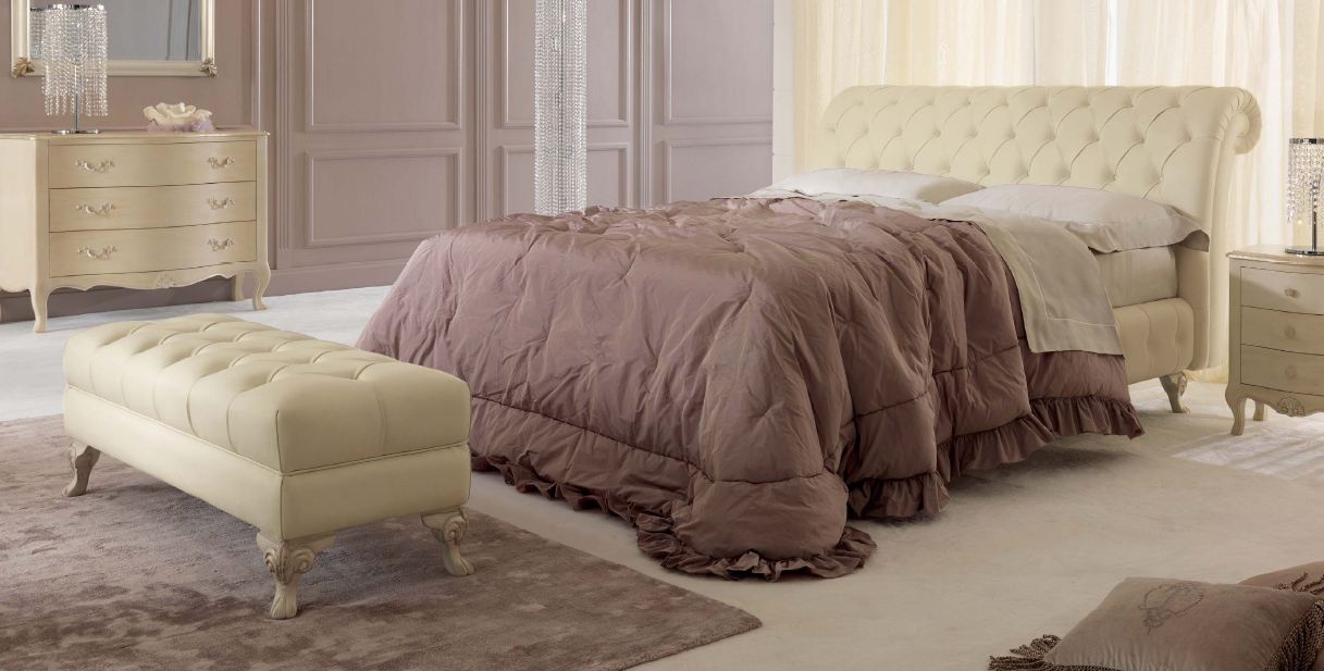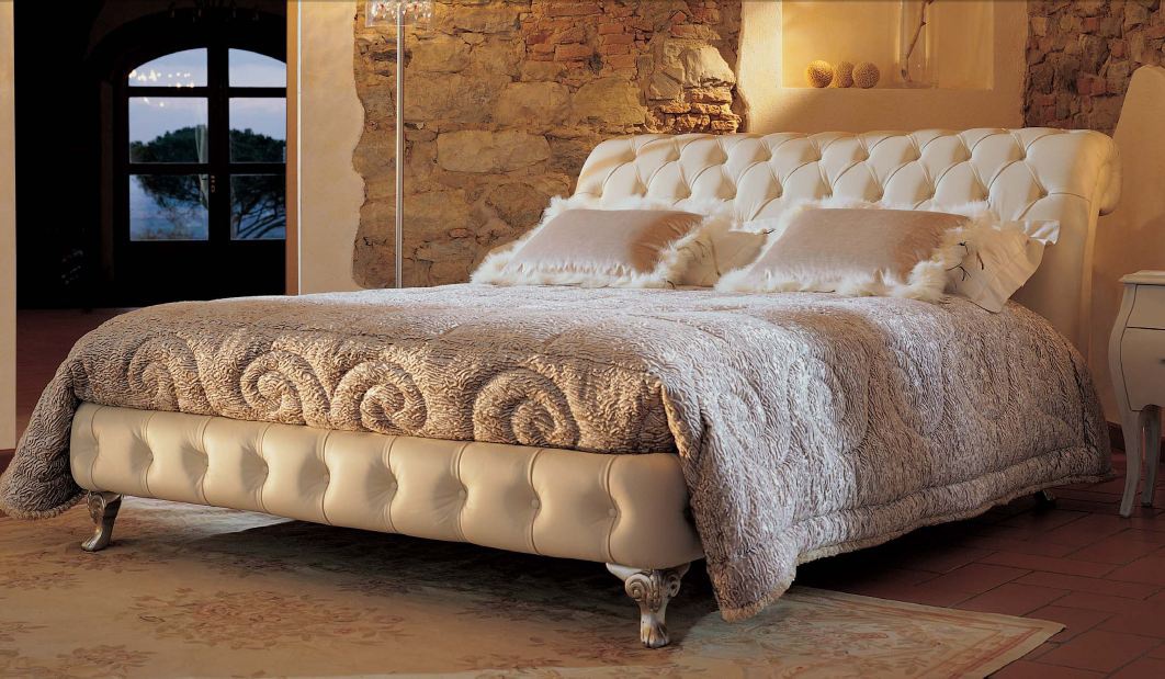 Set for bedroom George from the Italian manufacturer Tosconova. The set includes a double bed with high upholstered headboard, upholstered bedside bench. Products on a low carved legs in lacquer, decorated with stitch-Capito. Frame, base is made of solid wood. The upholstery is leather. Filler - polyurethane foam. The choice - a wide range of textures, rich palette of colors, shades.