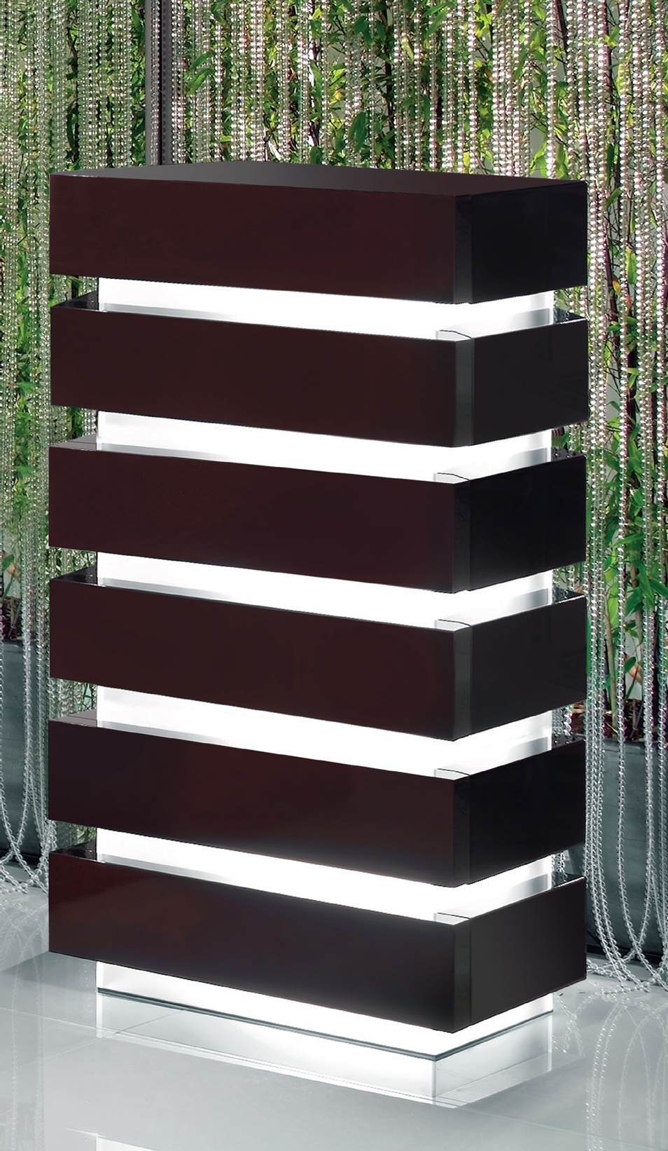 Chest Luce from the Italian manufacturer Reflex Angelo. The model, reminiscent of French linen cupboard, seminar, made in art Deco style. The body of the dresser is made of wood and frosted glass. The model is equipped with six drawers in a lacquered finish veneer walnut Canaletto; the model is also available in the finish polished ebony veneer. There is an internal illumination. Colours in stock.