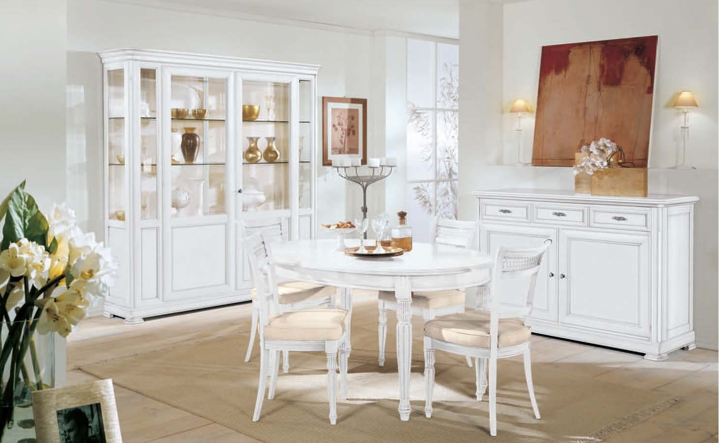 Dining room (dining set) from the Italian manufacturer Mirandola Export. Dining room is from the Cabinet, a sideboard, a dining table and chairs. A style classic. The frame is wood, upholstery of chairs and textiles. Showcase has two glass doors and glass shelves inside. A sideboard fitted with three drawers and two doors. Oval dining table - sliding. The chairs have a carved back and upholstered seat. Mirandola Export set will be a wonderful decoration of Your dining room.