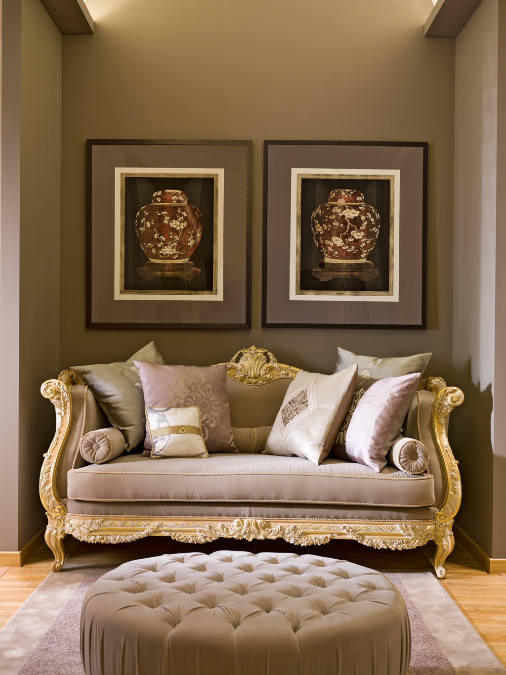 A double sofa from Italian manufacturer Medea. The model with high backrest and armrests. The frame is made of wood. Upholstery textile. Decoration is the decorative carving handmade. Complement the design of cushions of different size and shape.