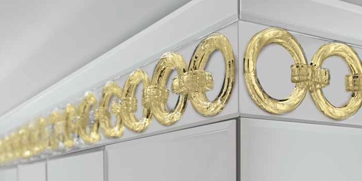 Wardrobe modular wardrobe Casanova from the Italian manufacturer Reflex Angelo. An elegant model that combines the lightness and finish of expensive materials, decorated with glamorous modern bedroom interior. The Cabinet is made of maple and lined with a mirrored or lacquered coloured glass. The size of the Cabinet and the final configuration determined by the customer. The top and bottom of the Cabinet around the perimeter decorated with transparent rings made of Murano glass. Available also colored rings. Doors with push-pull opening or with handles in Murano glass, transparent or colored to match the finish. Inside there are shelves, glass, or natural maple wood hanger-pipe and a wooden dresser. Additional options: internal lighting system and diffuser of essences, made of Murano glass. Colours in stock.