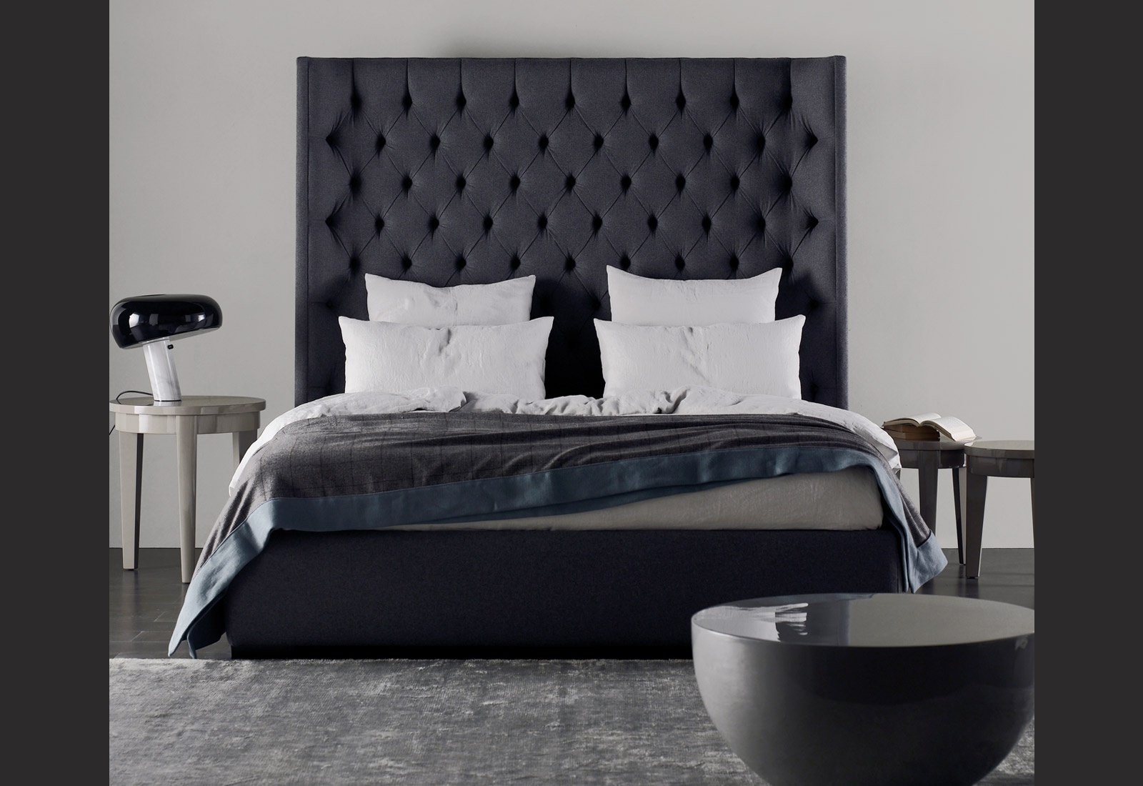 Double bed with high headboard Thurman from the Italian manufacturer Meridiani. The frame is made of wood with upholstered headboard. Upholstered in textile or leather from a range of campaigns. The model is decorated with stitch Capito. A wonderful choice for the bedroom in modern style. Color range: brown, beige.