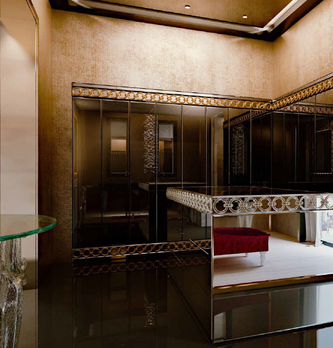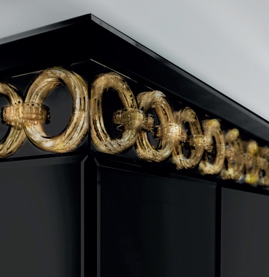 Casanova wardrobe system from the Italian manufacturer Reflex Angelo. Luxurious and elegant, combining lightness and airiness with the finish of expensive materials, will realize all Your wishes concerning design, dimensions and accessories of the wardrobe of Your dreams. The body is made of maple in the mirror or veneer lacquered coloured glass. The top and bottom by transparent perimeter are decorated with rings of Murano glass. Available also colored rings. Interior trim and accessories - shelves, glass, or natural maple, hanger pipe, wooden cupboard, lighting system, diffuser of essences, made of Murano glass, etc. - are carried out according to the wishes of the customer. Colours in stock.