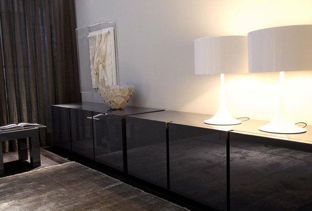 Dresser-chest Bolkan from the Italian manufacturer Meridiani. The frame is made from solid wood, legs - brass, finish - veneer / gloss varnish. Model with drawers for bedroom in a modern style. Colors: gray, black.