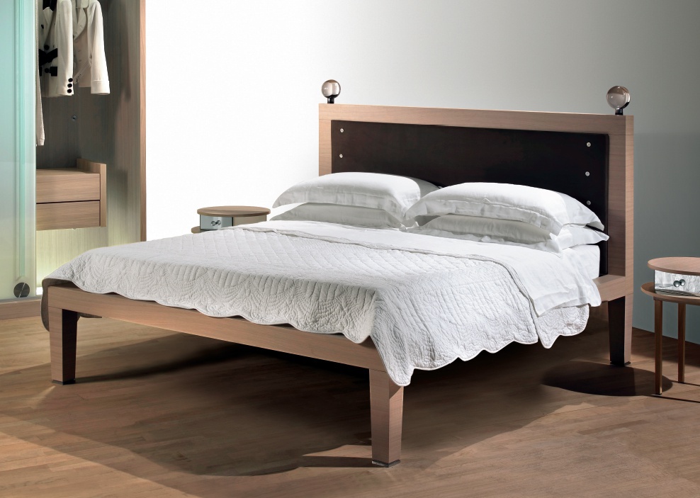 Lido double bed from Italian manufacturer Reflex Angelo. Lovely cosy bed in a grunge style from designer Andree Putman will adorn any bedroom interior. Frame, high headboard and legs made of oak in wenge finish or white washed. Feet shod in Slippers made of stainless steel. Soft headboard upholstered in velvet, leather or nubuck on the sides trimmed with studs in stainless steel. On top of the headboard is decorated with beads made of Murano glass. The bed is available in five sizes with matching mattresses. Colours in stock.