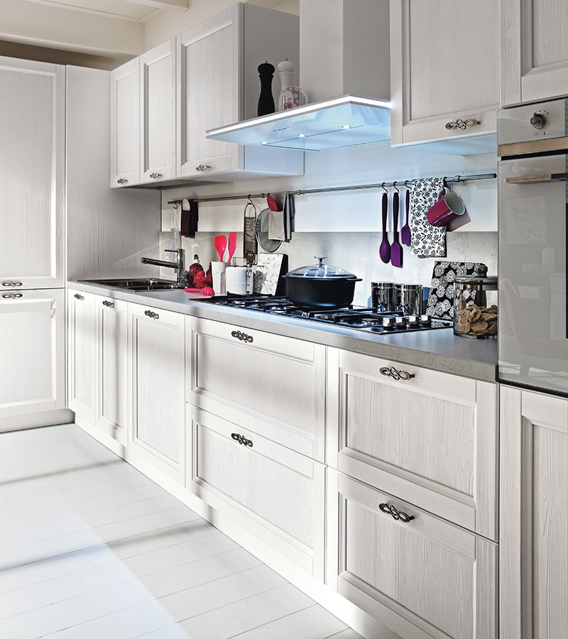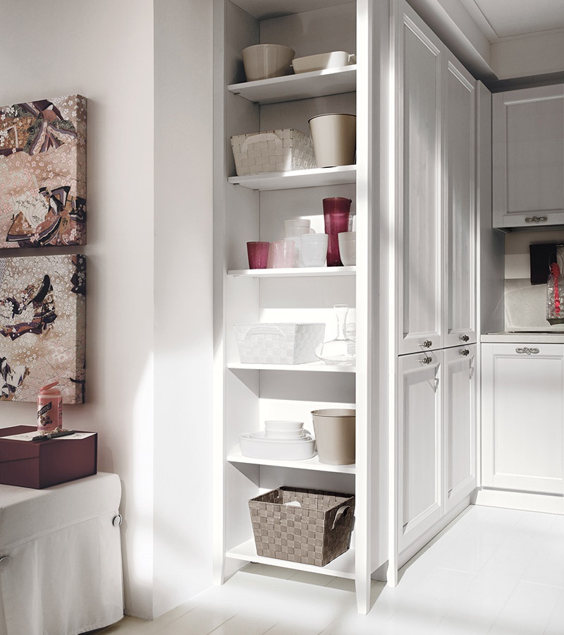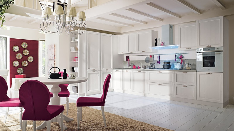Kitchen Neve e Ciclamino from the Italian manufacturer Callesella. The headset frame is made of wood. Modern look in a rustic style. White trim with a hint of cyclamen to give a touch of freshness and comfort. The table top is made of stone. Built-in appliances. Kitchen filled with sections and drawers with inner filling. Shelves, hooks and rails will provide maximum use of space.
