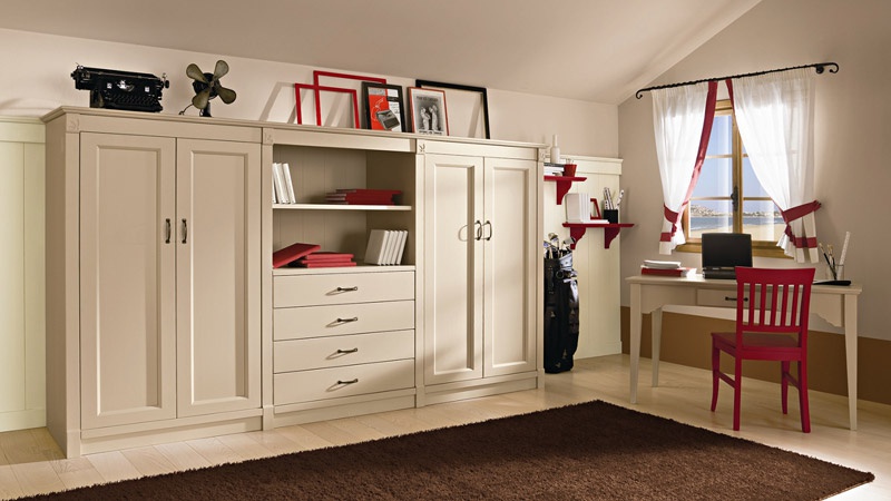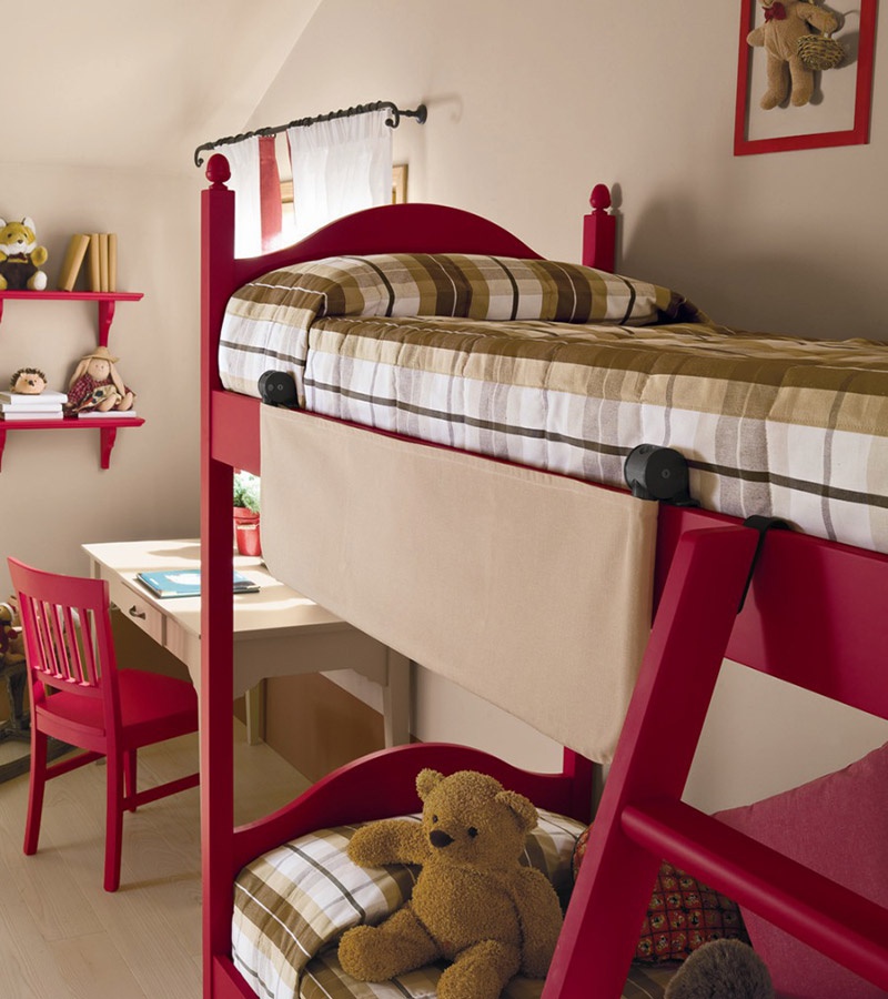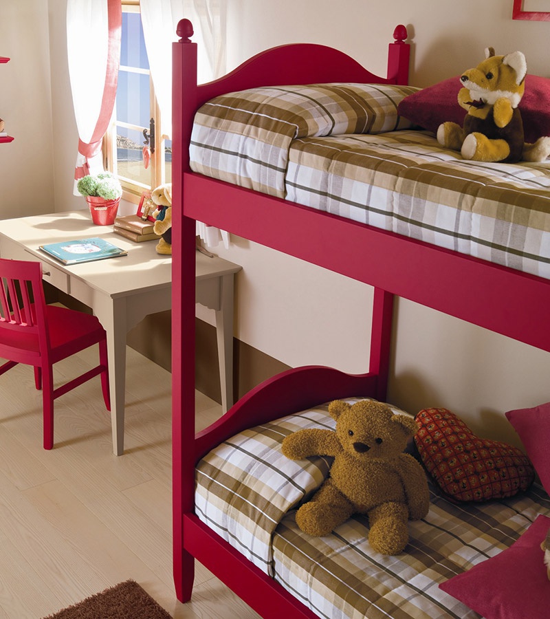Bedroom set with bunk bed from Italian manufacturer Callesella. Set with a bed, Desk, wardrobe, chair and shelves. Wardrobe of four sections. Bunk bed with metal fasteners and wood stairwell. The model is suitable for rooms with limited space.