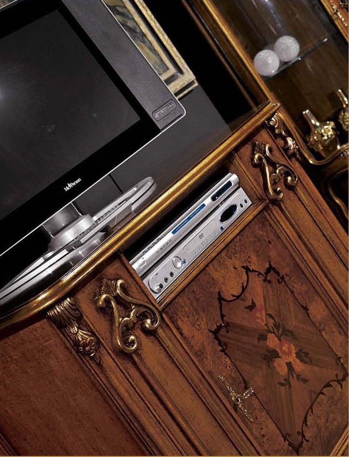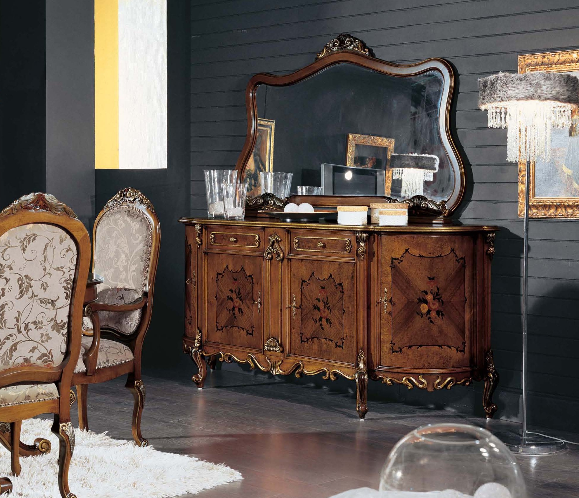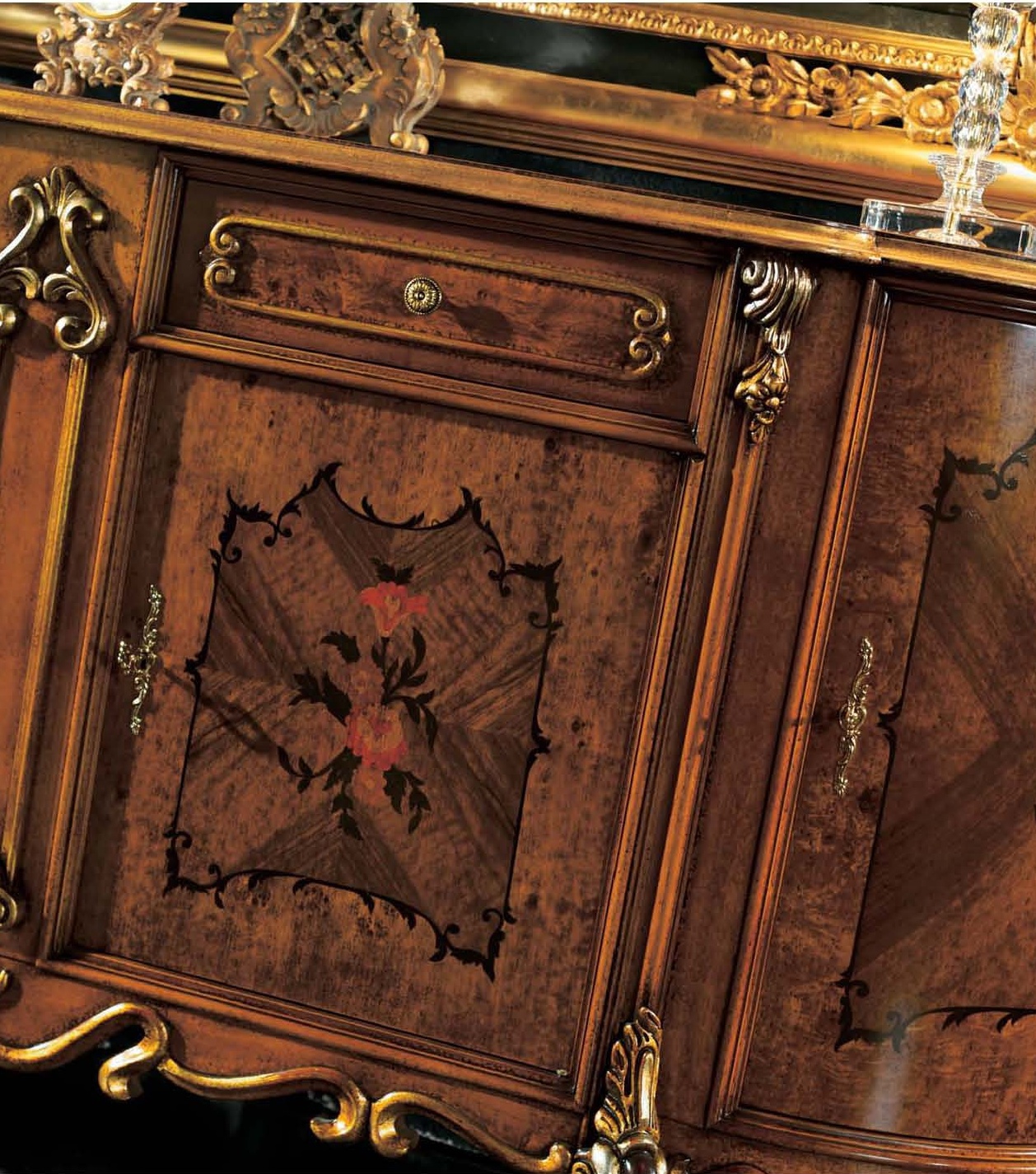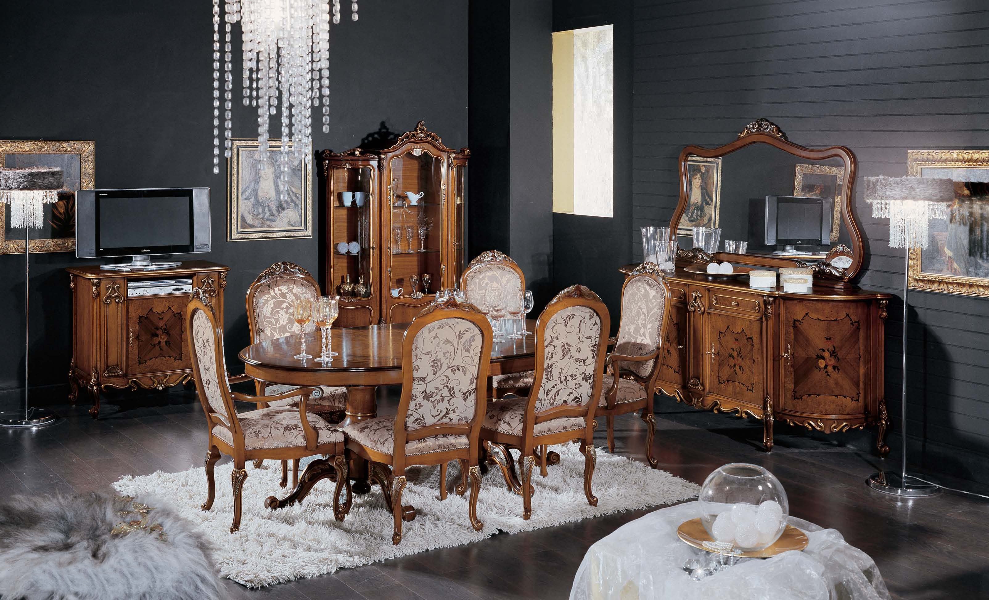 Dining room (dining set) from the Italian manufacturer Mirandola Export. Lovely model made of wood, upholstery - textiles. Set consists of a sliding oval dining table, chairs with or without armrests, sideboard with drawers, cabinets for TV with compartment for equipment and display cases with glass shelves. The product is decorated with decorative inlay and carvings. Mirandola Export set will decorate any interior in a classic style.