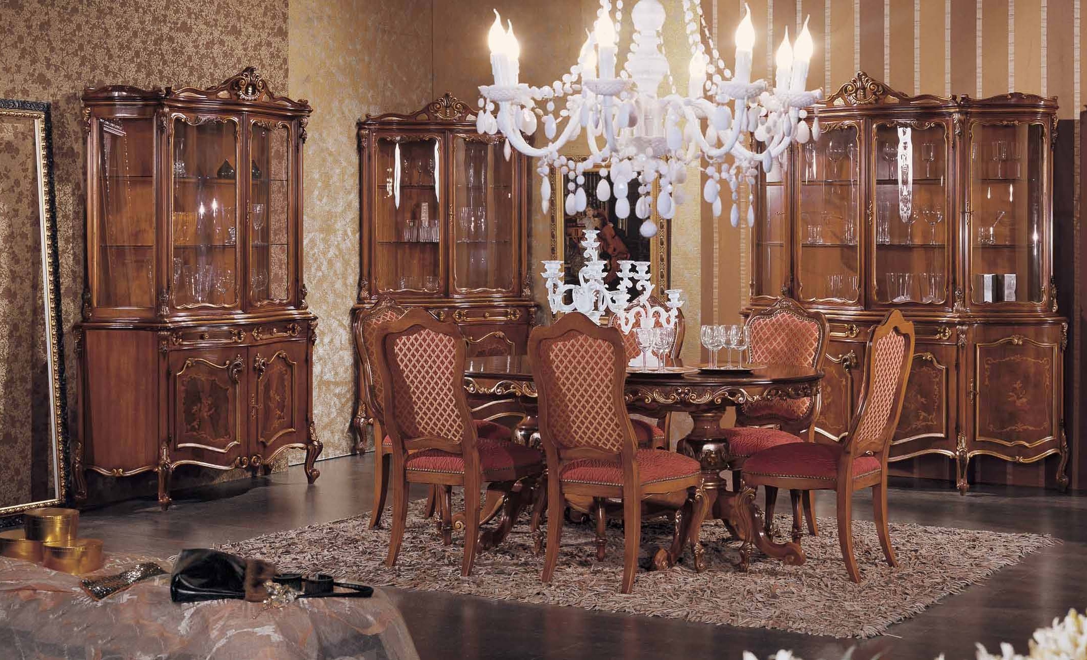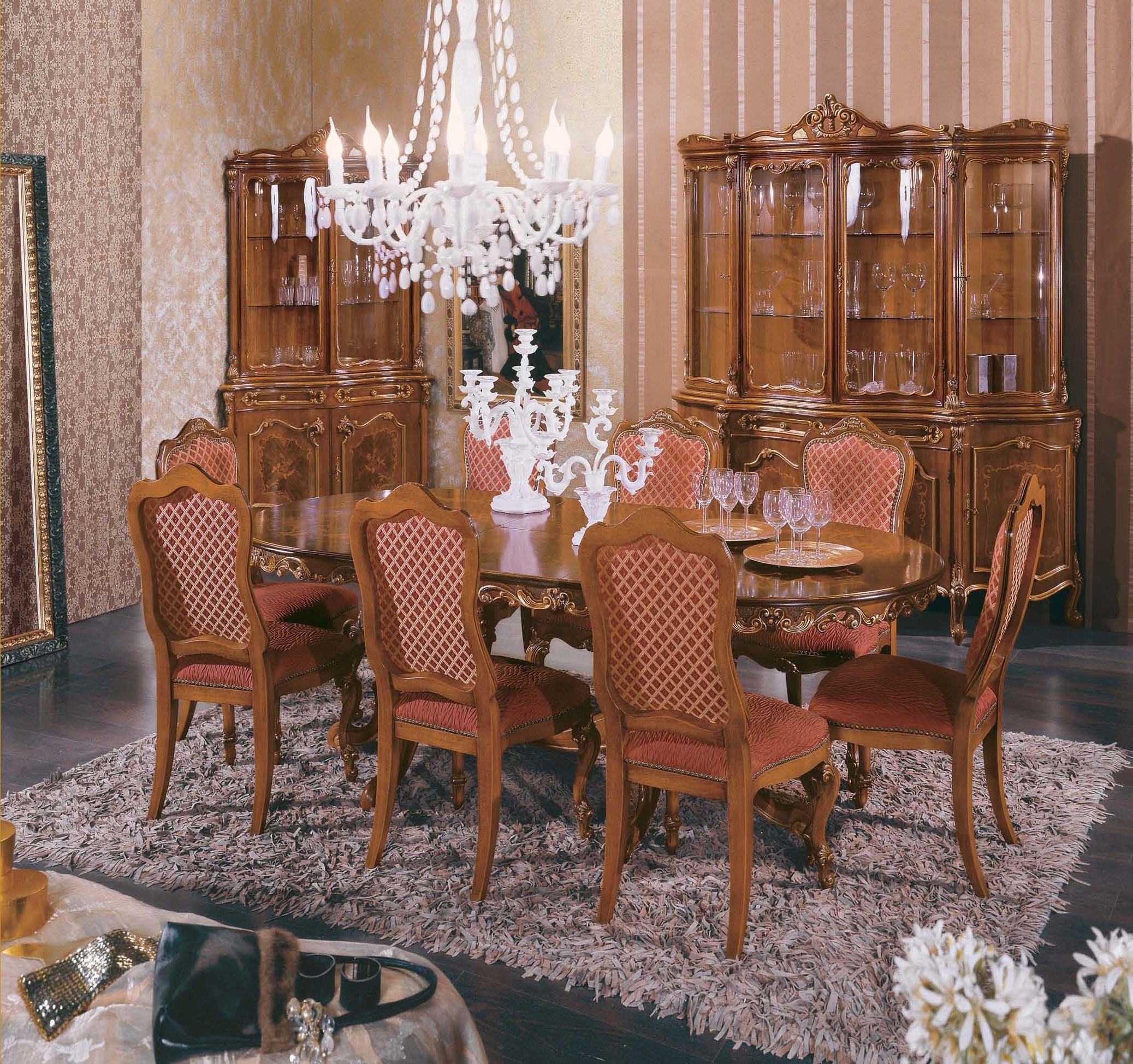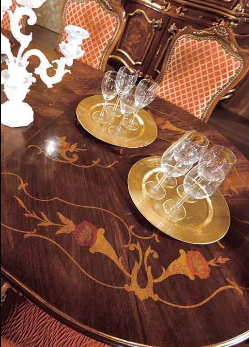 Dining room (dining set) from the Italian manufacturer Mirandola Export. A style classic. The frame is wood, upholstery - textiles. Set consists of dining table and chairs. The sliding table is oval and is decorated with ornamental carving and inlay on the table top. The product may have different sizes. The chairs have a soft comfortable backrest and seat. Graceful and gorgeous Mirandola Export set will make Your dining room cozy and elegant.