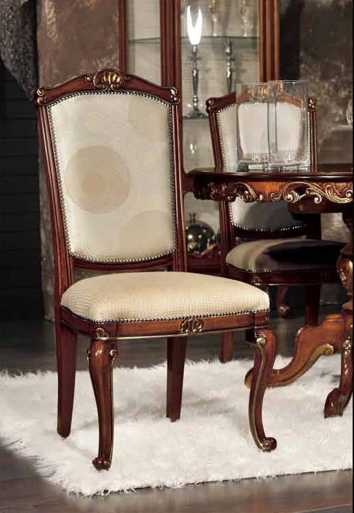 Dining room (dining set) from the Italian manufacturer Mirandola Export. Set comprises of sideboard with three doors and a drawer, round extending table and chairs with soft upholstery. The frame is made of wood, upholstery - textiles. The style is classic. The model is decorated with decorative carved pattern. Mirandola Export set will decorate any interior.
