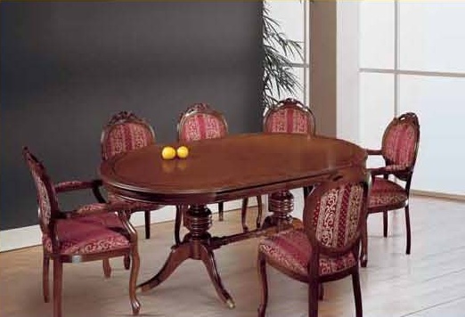 Dining room (dining set) from the Italian manufacturer Mirandola Export. Set includes: oval extendable dining table with two carved legs and chairs with soft upholstery and without armrests. Frame of table is made of walnut wood, upholstery of chairs and textiles. Comfortable classic typefaces Mirandola Export perfectly into any interior.