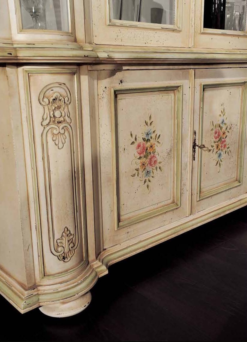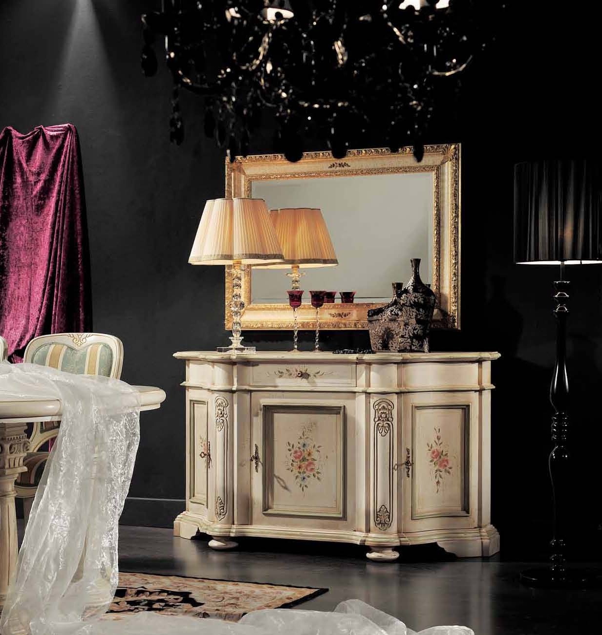 Dining room (dining set) from the Italian manufacturer Mirandola Export. The classic set has a wooden frame, upholstered chairs - textile. Set consists of a sideboard, buffet, dining table with two carved legs and chairs with soft upholstery. The table can be of different sizes. The product is decorated with decorative pattern on the facade. Original Mirandola Export set will make Your dining area graceful and elegant.