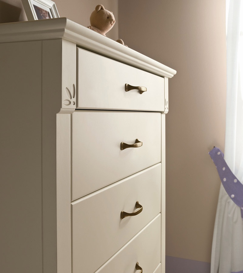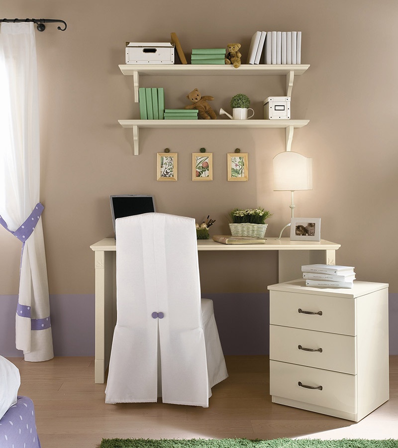 A set for the bedroom with single bed NORMA from the Italian manufacturer Callesella. Set with bed, bedside table, Desk, chair with cover, drawers and shelves. Dresser with seven drawers. Bedside table with three drawers. Desk with pull out table on wheels with three drawers. Single bed made of wood with upholstered headboard.