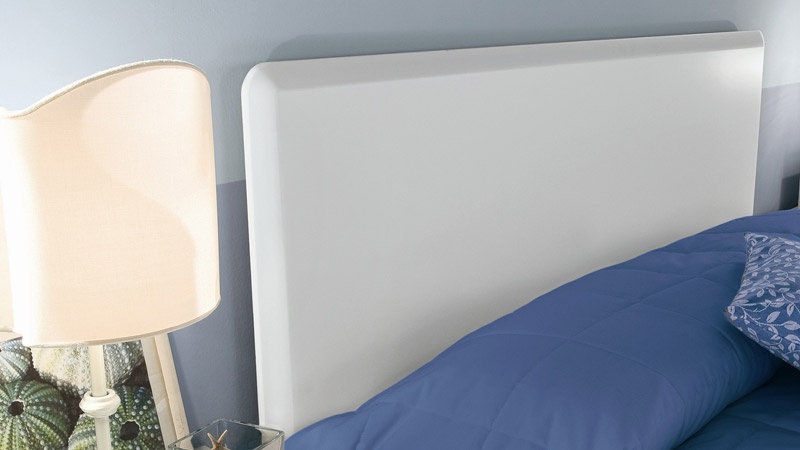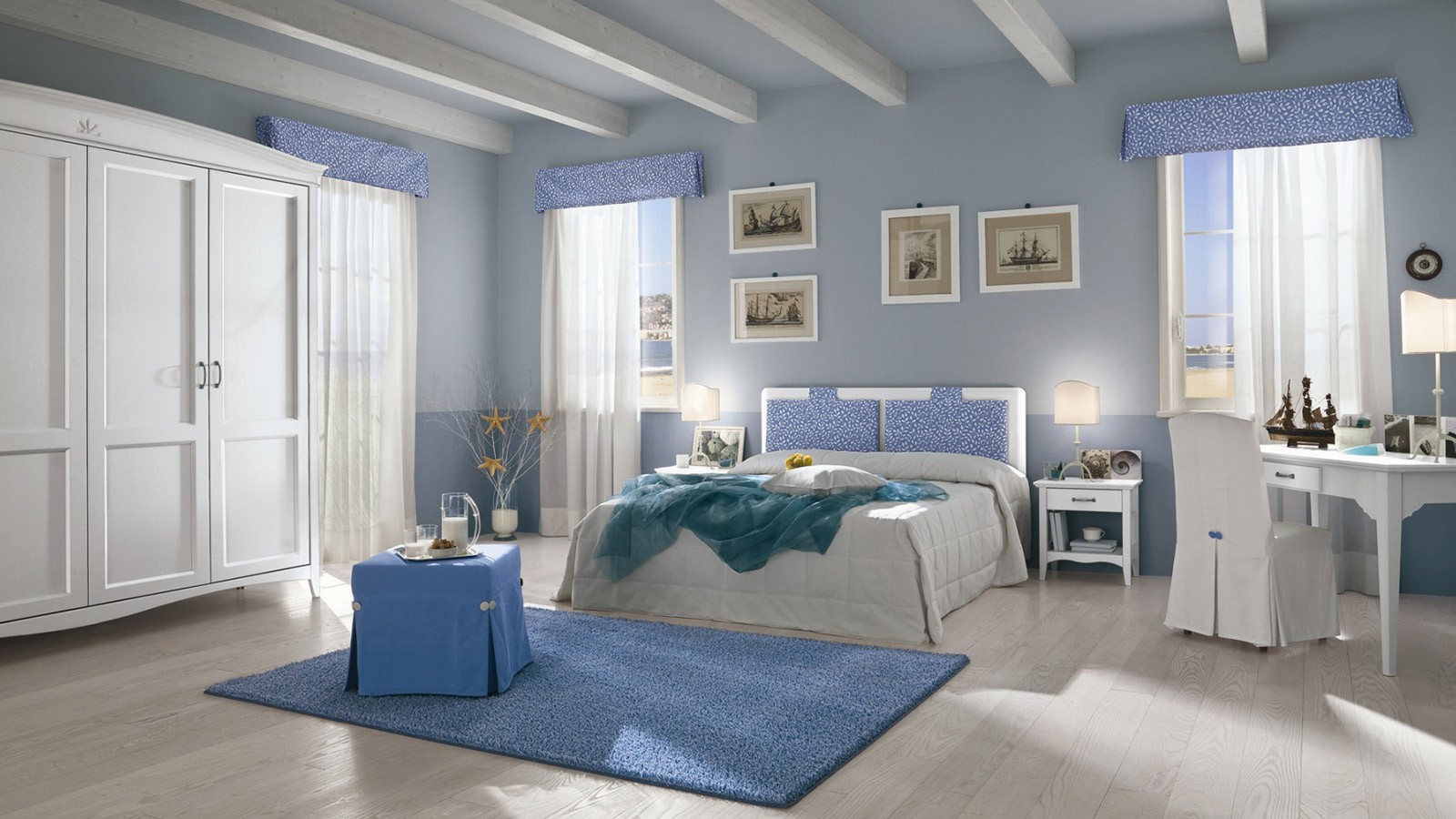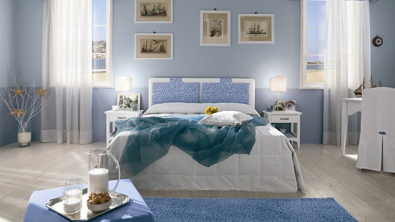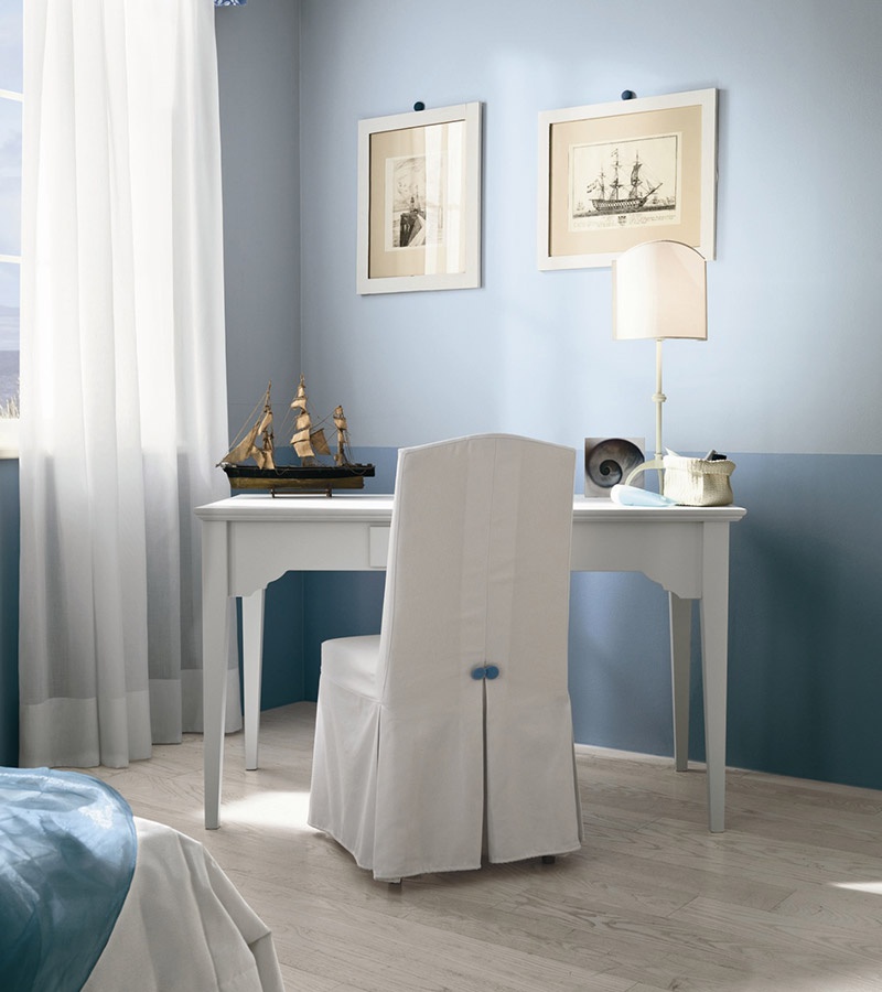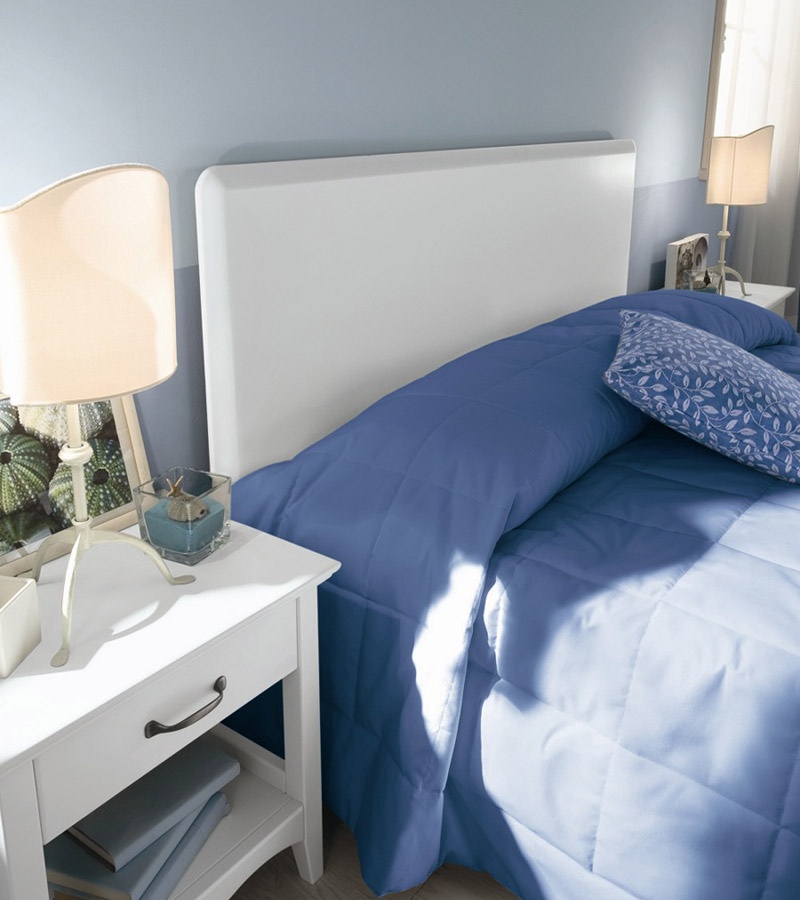 Set bedroom with double bed STELLA from the Italian manufacturer Callesella. Set with bed, bedside tables, a Desk with a drawer, chair with cover, stool and wardrobe. Bedside tables with one drawer. Wardrobe with four sections. STELLA double bed made of wood with drawer for storage and two pillows on the headboard.