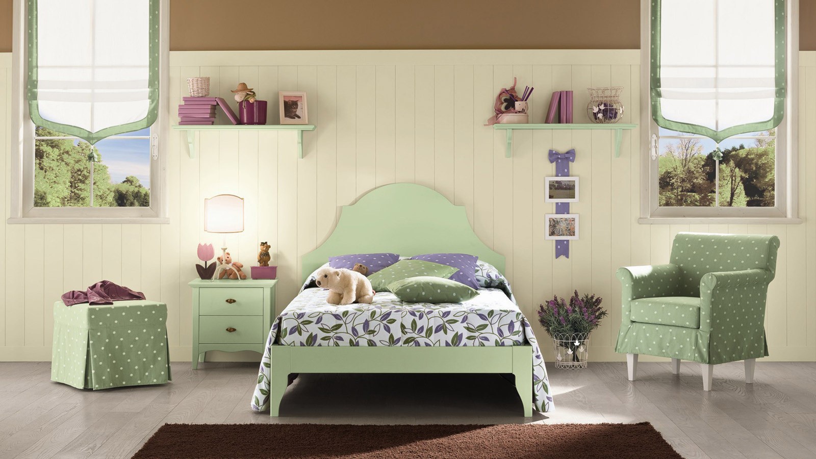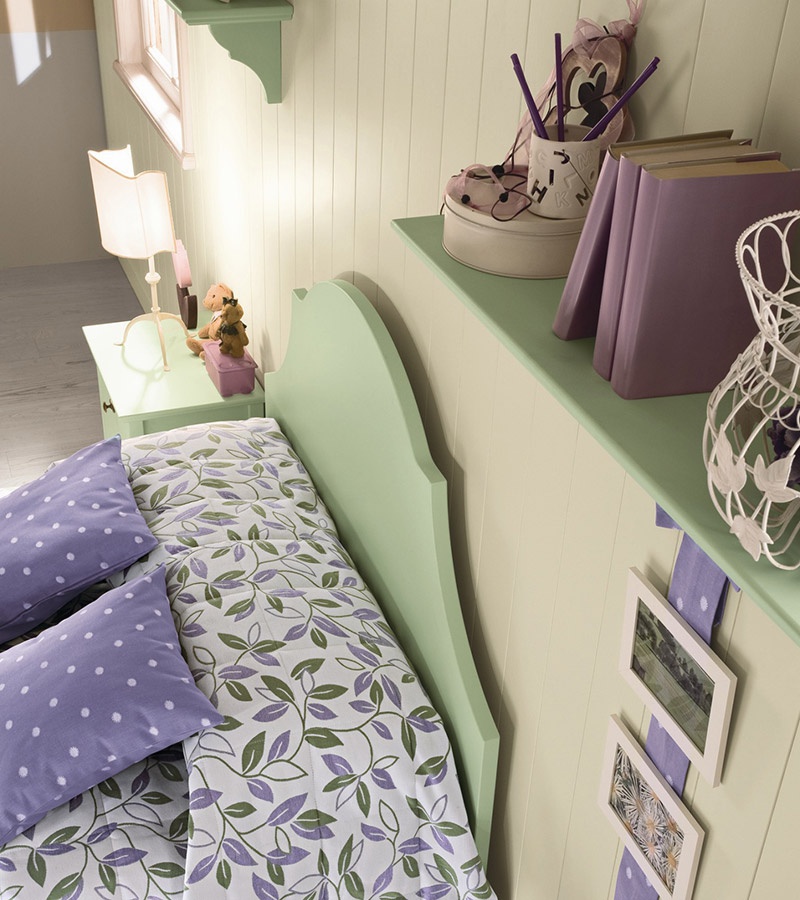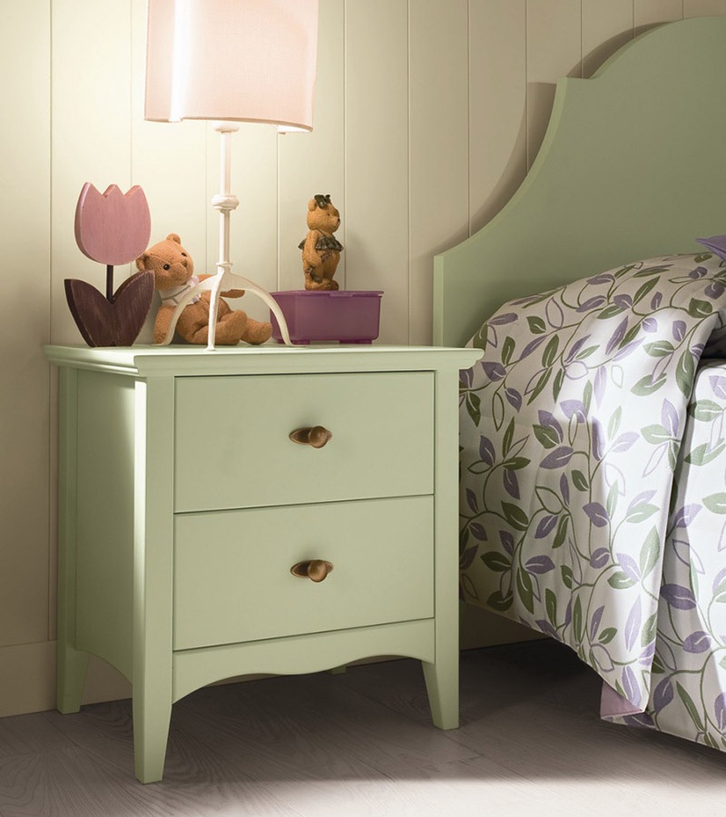 A set for the bedroom CAMPANA from the Italian manufacturer Callesella. Set with a bed, a bedside table with two drawers, shelves, a stool and an armchair to relax in. The bed is made of wood with a high headboard. Model of modern design.