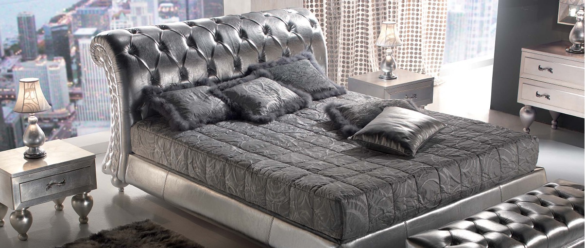 Set for bedroom David from the Italian manufacturer Tosconova. The set includes: double bed, bedside tables, chest of drawers, upholstered bench with storage space. For upholstery, leather catalog, filler - polyurethane foam of different densities. The facade of the cabinets, drawers varnished from the range. Offers a wide selection of textures and colors. Ornament stands diamond quilting and a patent leather round legs. Style classic.