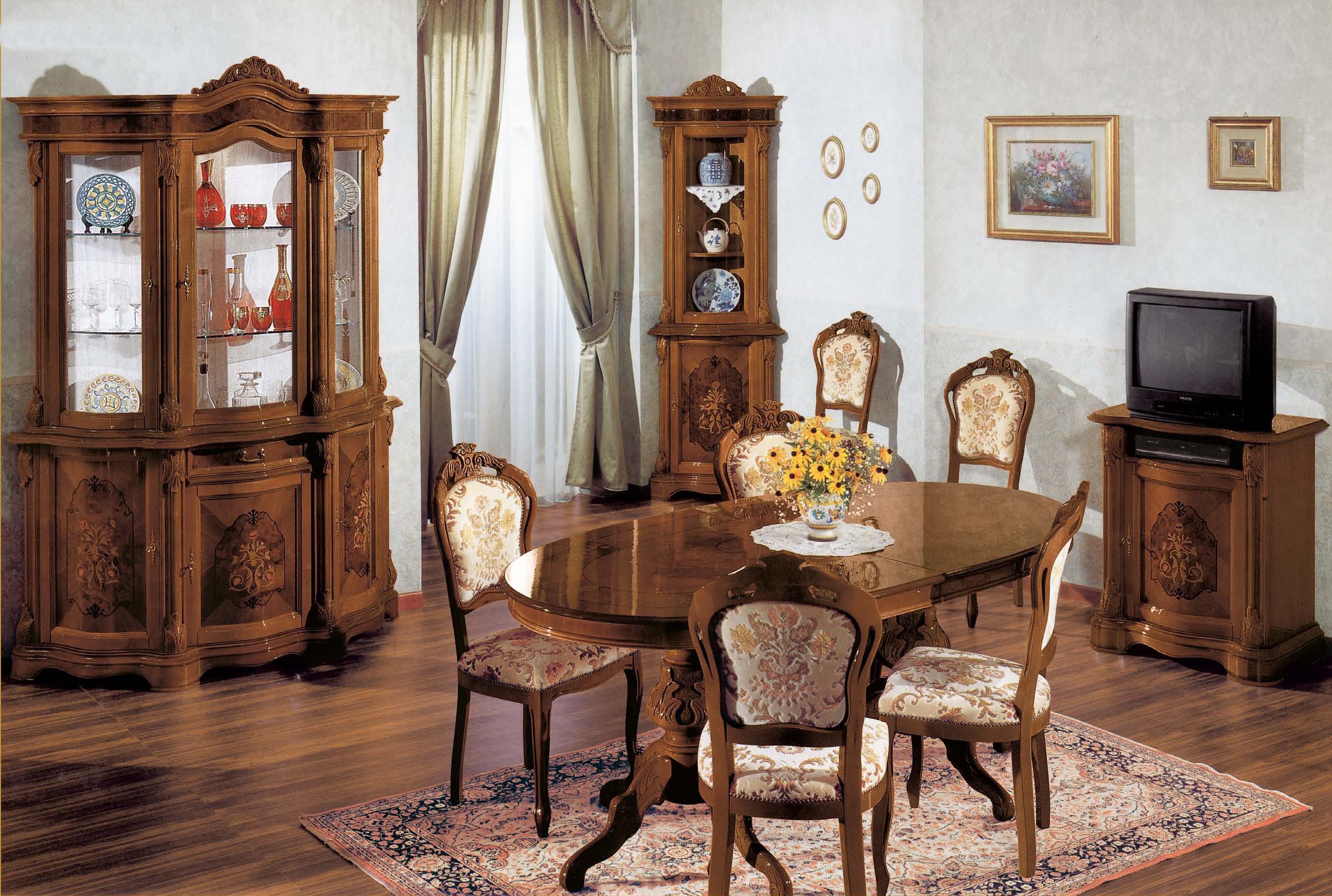 Dining room (dining set) from the Italian manufacturer Mirandola Export. Elegant set has a decorative facade decorated with inlaid and carved patterns. A style classic. The frame is made of wood, upholstery - textiles. Set consists of a sideboard, corner display cases, cabinets for TV, patio oval dining table and chairs with soft upholstery. Dining room Mirandola Export - the perfect choice for Your interior.