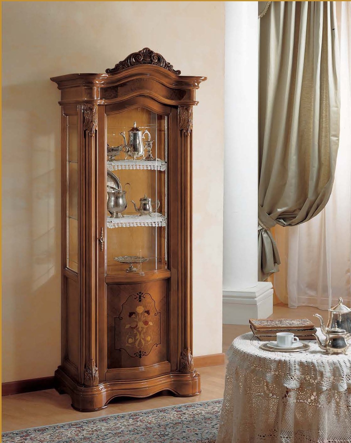 Showcase from Italian manufacturer Mirandola Export. Showcase is made in the classic style. The frame is made of wood. The model has a single glass door, glass sides and glass shelves. On the facade is a decorative inlay. Showcase Mirandola Export carved with a decorative pattern will be the main decoration of Your interior.