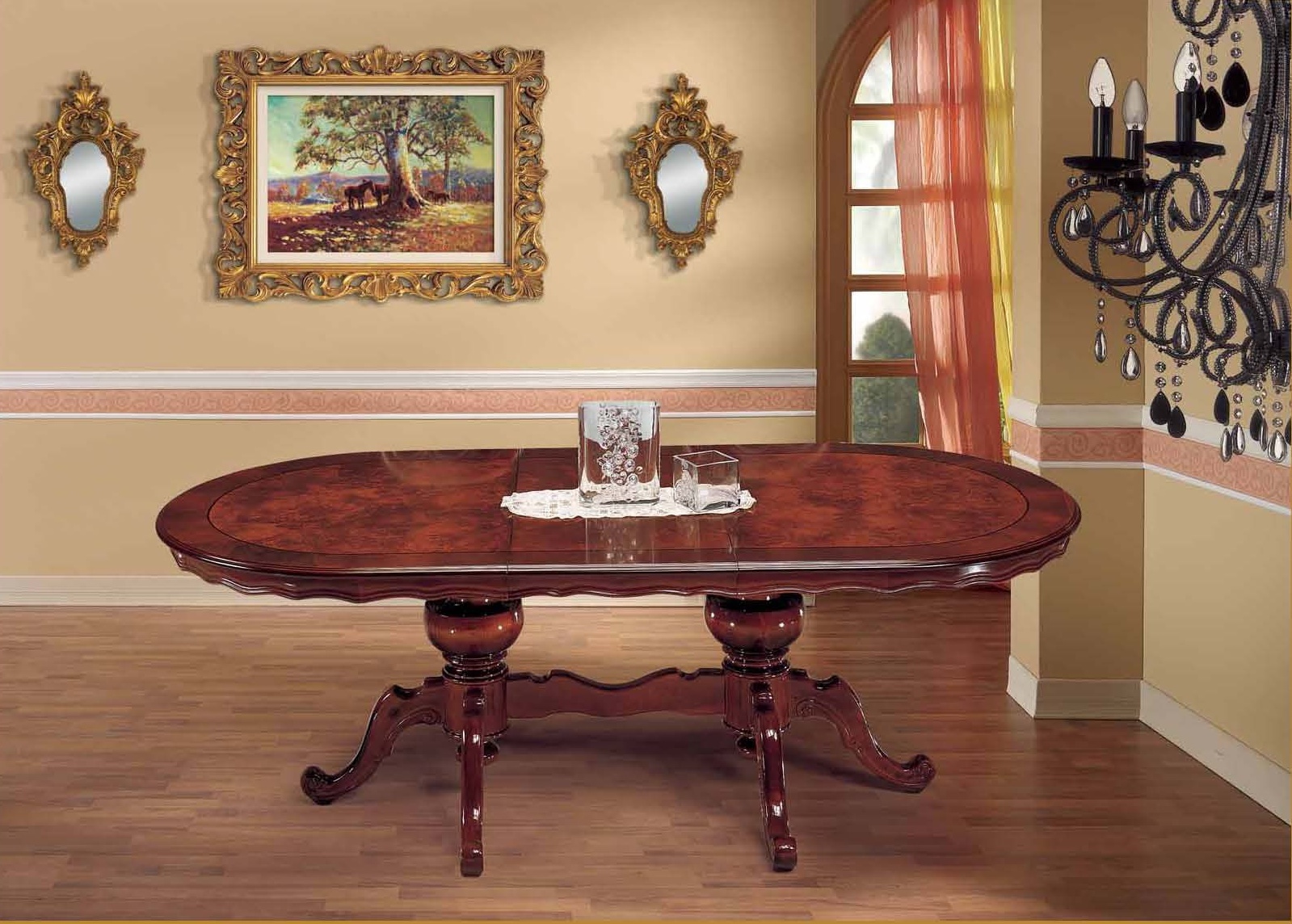 Dining table from the Italian manufacturer Mirandola Export. The frame is made of wood. The product is made in the classic style. The sliding table is oval and has two decorative carved legs. Beautiful dining table Mirandola Export will create a pleasant atmosphere in Your dining room.