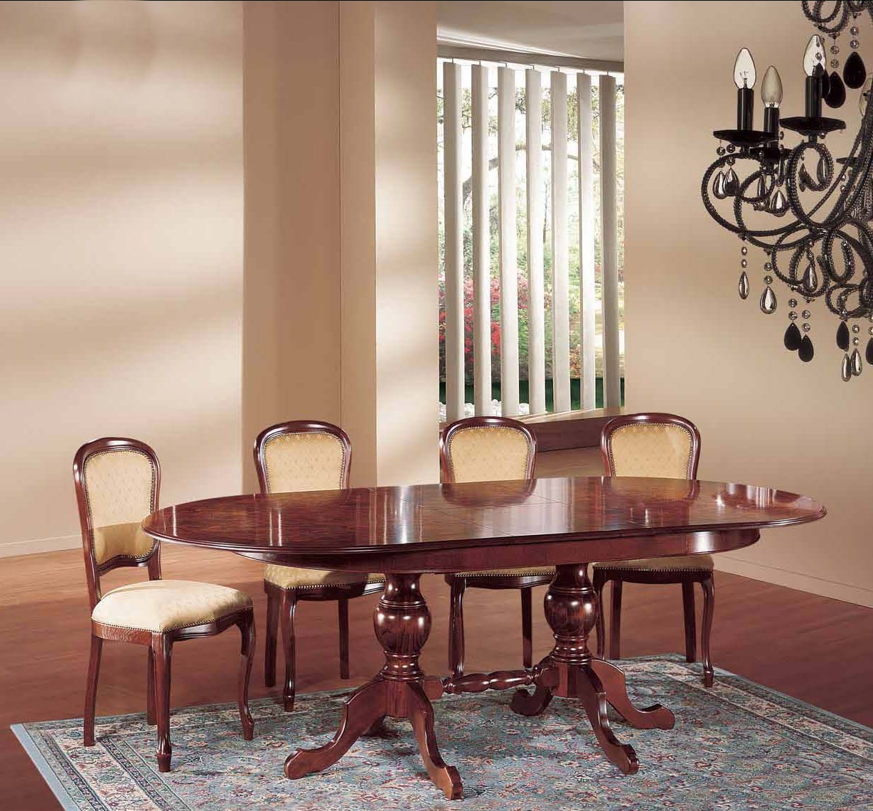 Dining room (dining set) from the Italian manufacturer Mirandola Export. Set includes: oval dining extendable table with two carved legs and chairs with comfortable upholstered seat and backrest. Frame products made of wood, upholstery of chairs and textiles. A style classic. Mirandola Export set will adorn Your interior.