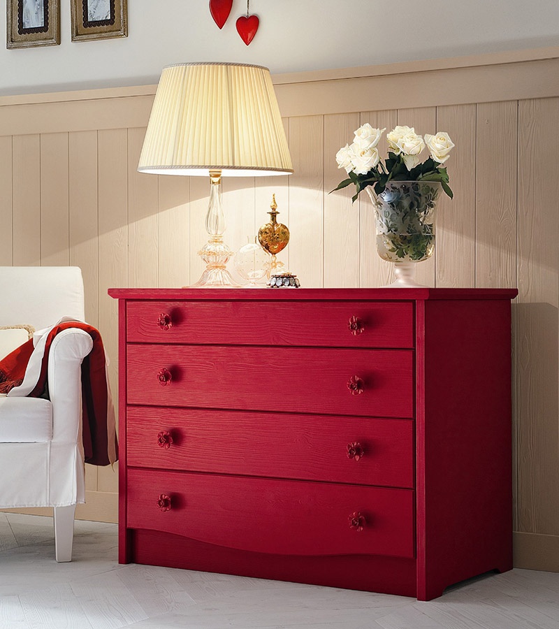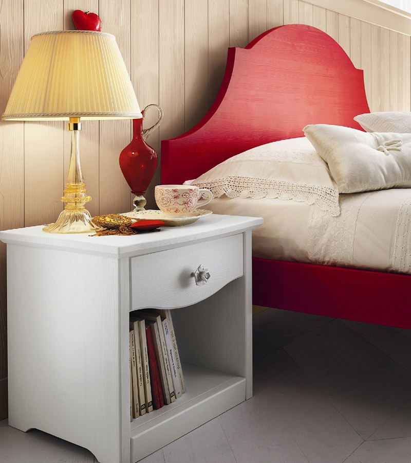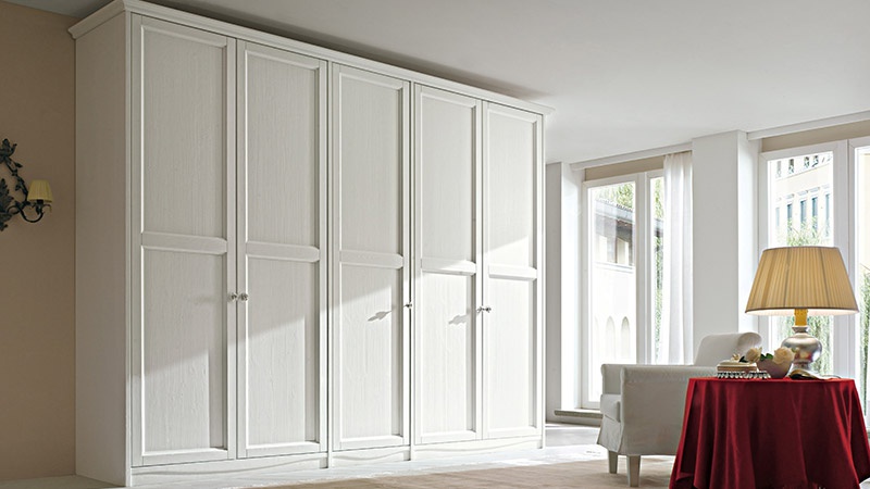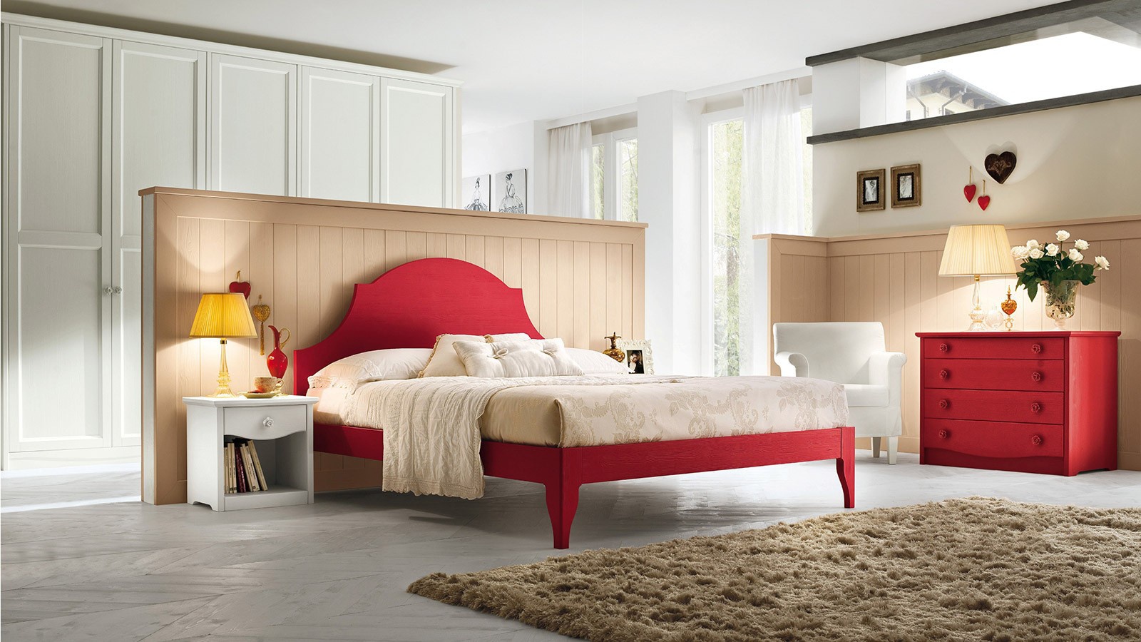 Set for double bedroom Campana from the Italian manufacturer Callesella. Set with bed, two bedside tables, chest of drawers, a small armchair and a wardrobe. Bedside tables with drawer. Dresser with four drawers. Wardrobe with five sections. Double bed with high headboard with carved elements. The modern design.