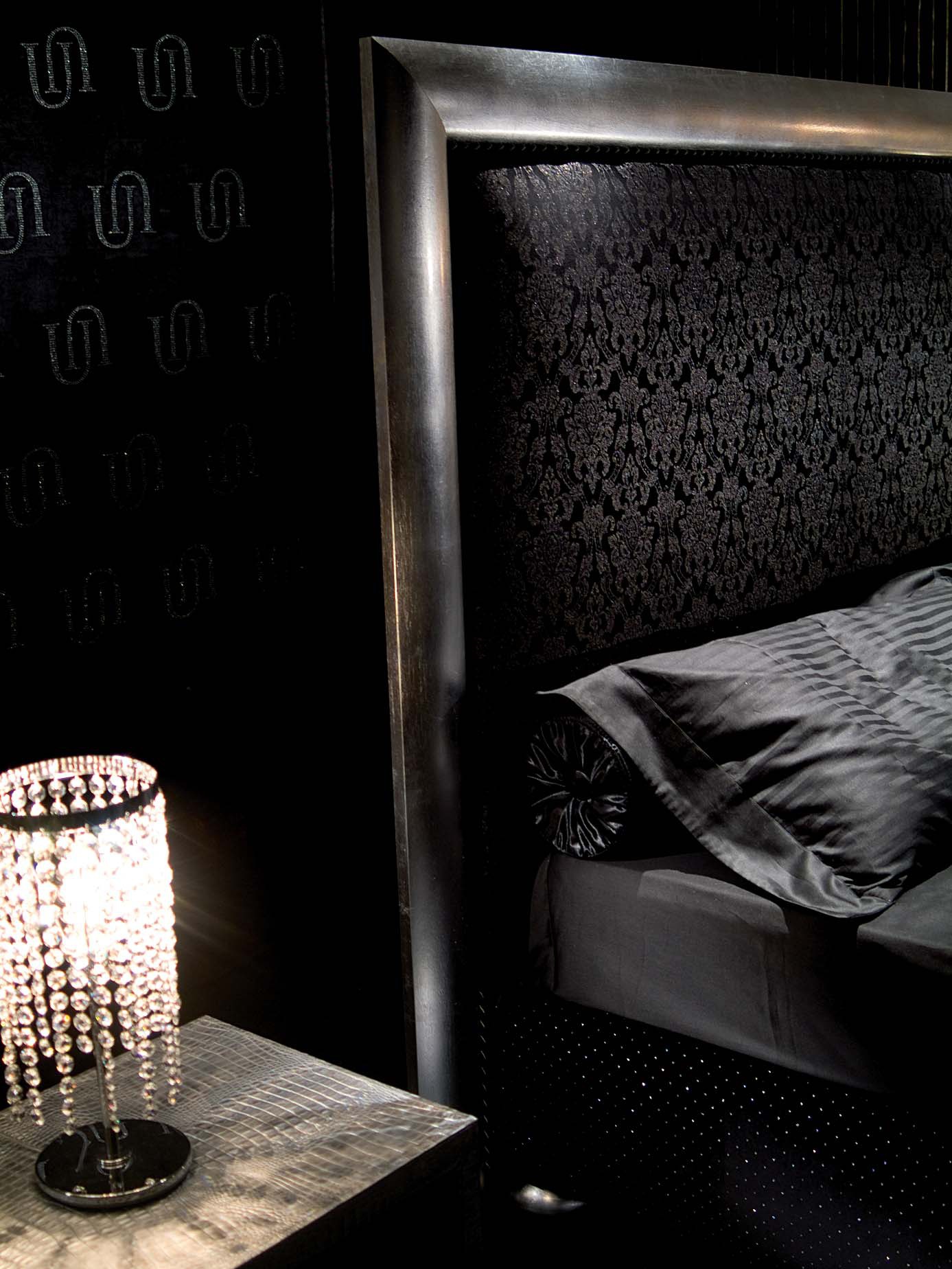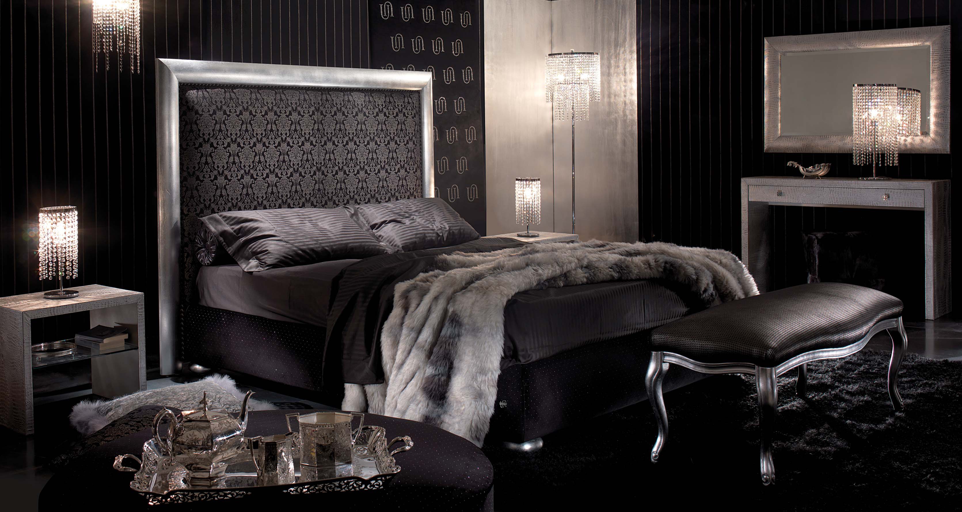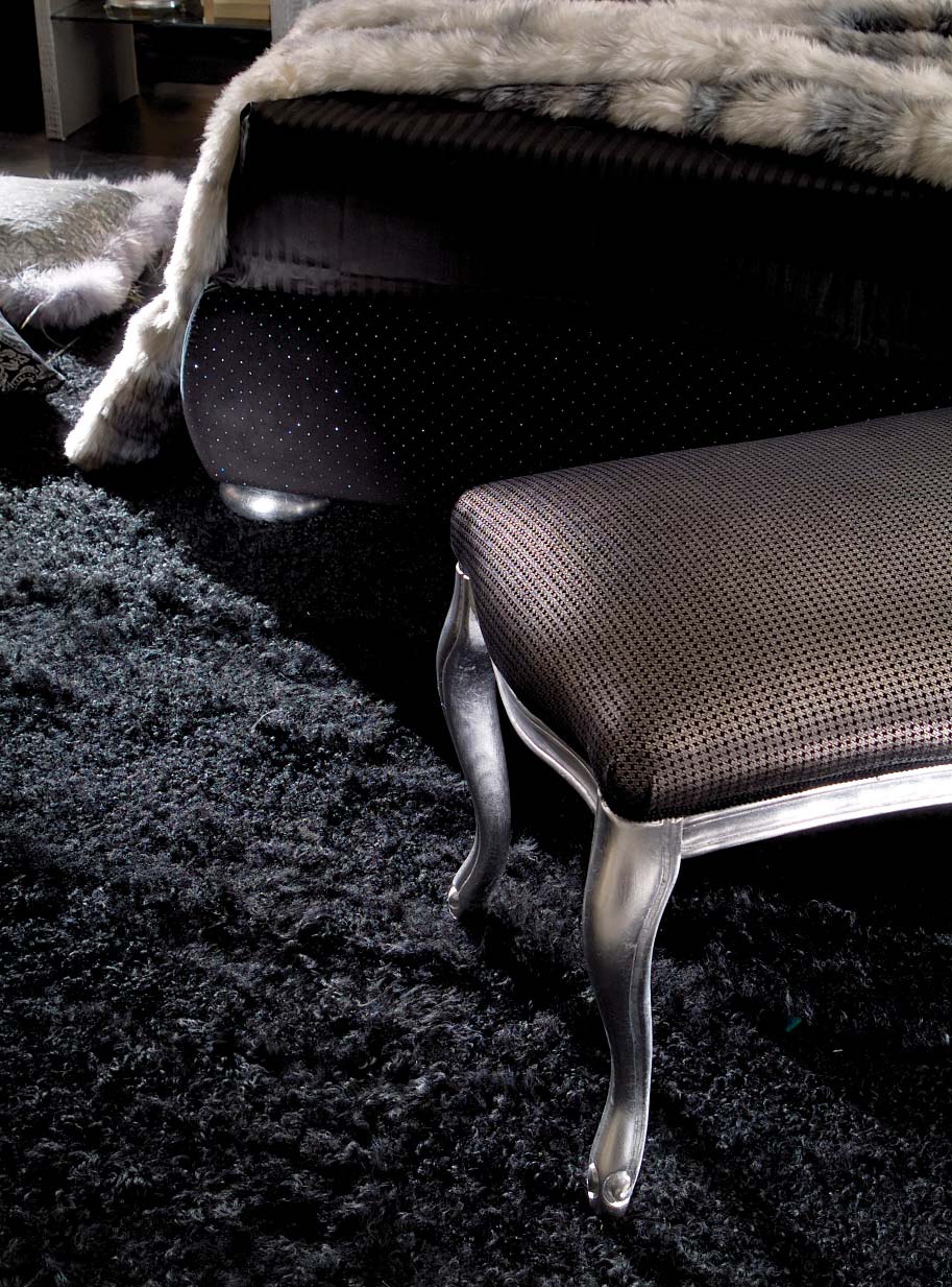 A set for the Deluxe bedrooms from Italian manufacturer Tosconova. The set includes: double bed with high upholstered headboard, bedside bench, pouf round. Textile acts as upholstery, available choose from the range, as a filler - polyurethane foam of different densities. Decor stands silver foil covering the visible parts of the frame. A wide range of textures, colors, sizes gives you a choice of products according to their preferences and the requirements of the interior. The style is modern.
