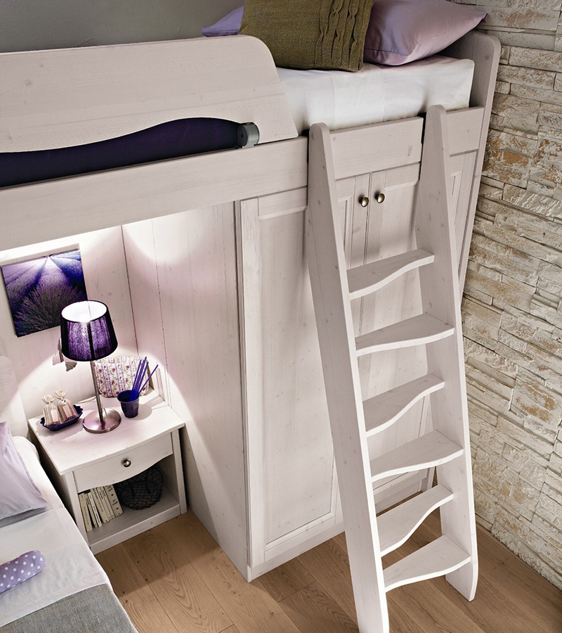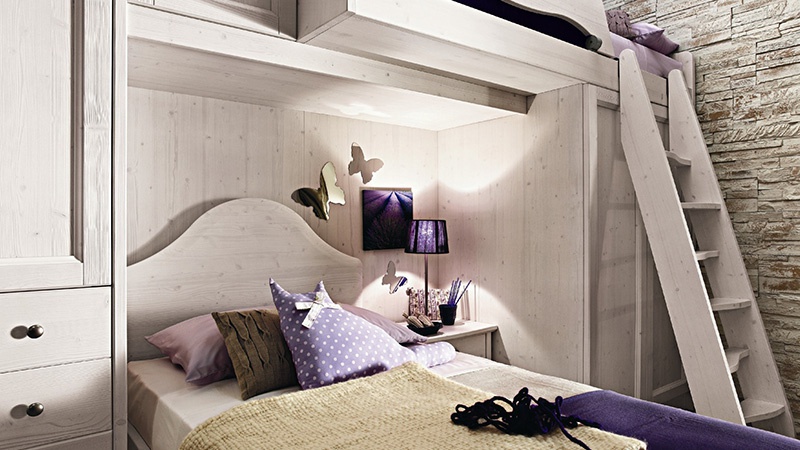 Headsets for bedrooms with high bed and a single bed will be exposed from the Italian manufacturer Callesella. Set high and a single bed, Desk, shelves, wardrobe, chair and shelves. Chair with soft cushion. Set is made of wood and MDF with a Matt finish.